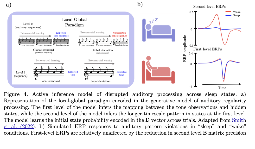 迄今为止,主动推理模型尚未被应用于操纵意识状态的实验(但关于理论综述,请参见 Hobson and Friston (2012))。然而,重要的是,意识状态的操纵以感觉和运动分离为特征 (Cirelli & Tononi, 2023),这至少从表面上看非常适合用主动推理的语言来解释。例如,对于发生在较长时间尺度上的刺激模式 violation 的神经元反应,在睡眠和麻醉状态下会发生变化,而对于发生在较短时间尺度上的模式 violation 的反应则得以保留 (Boly et al., 2011; Dehaene et al., 2011)。为了强调主动推理的解释普遍性,在本节中,我们对 Smith et al, (2022) 中提出的听觉规律性感知的层级模型进行了简单扩展。我们展示了针对性的精度操纵如何重现以下发现:通常在清醒状态下与检测“全局”(长时间尺度)听觉模式 violation 相关的晚期 P3b 事件相关电位成分 (Bekinschtein et al., 2009),在非快速眼动睡眠和快速眼动睡眠状态下消失,而对“局部” violation 的事件相关电位响应则得以保留 (Strauss et al., 2015)。我们简要概述模型结构以 contextualise 结果,并建议感兴趣的读者参考 Smith et al, (2022) 获取模型的分步描述。