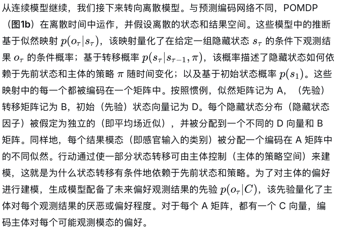 当前主动推理的最前沿技术将大脑描绘成一个由相互作用的生成模型组成的层级“混合模型” (Friston et al., 2017; Parr et al., 2021, 2022; Parr & Friston, 2018c)。支撑低层感官推断的生成模型采用预测编码网络的形式,对连续量(如运动和对比度)进行推断。然后,连续的低层感官系统通过连接函数(将连续量映射到离散潜在变量)与更高层的离散生成模型(例如,部分可观测马尔可夫决策过程,POMDPs)进行接口,后者执行分类感官推断并选择离散的行动序列(即策略),这些策略随后(再次通过连接函数)被转换回连续的运动指令 (Parr & Friston, 2018c)。关于连续模型的教程式综述,请参见 Bogacz (2017) 和 Buckley et al, (2017)。关于离散模型的详细数学综述,请参见 Da Costa, Parr, et al, (2020);关于更易理解的教程式综述,请参见 Smith et al, (2022)。关于连续和离散模型的专著级论述,请参见 Parr et al., (2022)。