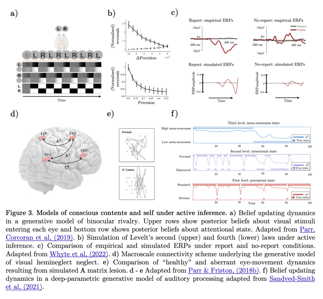 实际上,在从主动推理构建一个极简意识理论的过程中,一个自然的初步步骤(已经在进行中)是利用该框架对意识科学领域中作为范例的个别现象进行建模。在开发了这样的模型之后,人们可以探索它们的计算特性和行为,并将每个模型中的变量和参数映射到正在建模的特定意识过程的现象学方面。然后,每个模型都成为理论的一个构建块,随着更多模型的积累,理论也随之发展。通过这种渐进的过程,一个成熟的主动推理意识理论可能会逐渐成形。因此,这个过程的一个关键组成部分在于识别那些在意识科学的不同现象中既具有解释力又具有系统性的模型之间共有的计算特性(Atkinson et al., 2000; Seth, 2009)。重要的是,与该理论最初极简的性质一致,我们将局限于讨论意识神经科学中研究充分的范式,并避免推测超出这些实验任务的意识的更一般功能(包括潜在的进化起源)。实际上,我们的方法与其说是关于意识的涌现(参见,例如,Fleming & Michel, 2024),不如说是关于一个表现出与意识相关现象的系统的属性。
