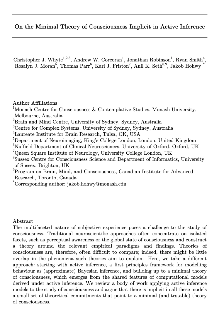 摘要 主观体验的多面性对意识研究构成了挑战。传统的神经科学方法往往集中于孤立的方面,例如知觉意识或意识的整体状态,并围绕相关的经验范式和研究发现构建理论。因此,各种意识理论通常难以相互比较;事实上,这些理论旨在解释的现象之间可能几乎没有重叠。在此,我们采取一种不同的方法:从主动推理——一种将行为建模为(近似)贝叶斯推理的第一性原理框架——出发,逐步构建一种极简的意识理论,该理论源于在主动推理框架下推导出的计算模型的共同特征。我们回顾了一系列将主动推理模型应用于意识研究的成果,并论证所有这些模型都隐含着一小组理论承诺,这些承诺指向一种极简(且可检验)的意识理论。