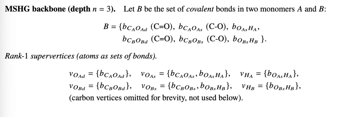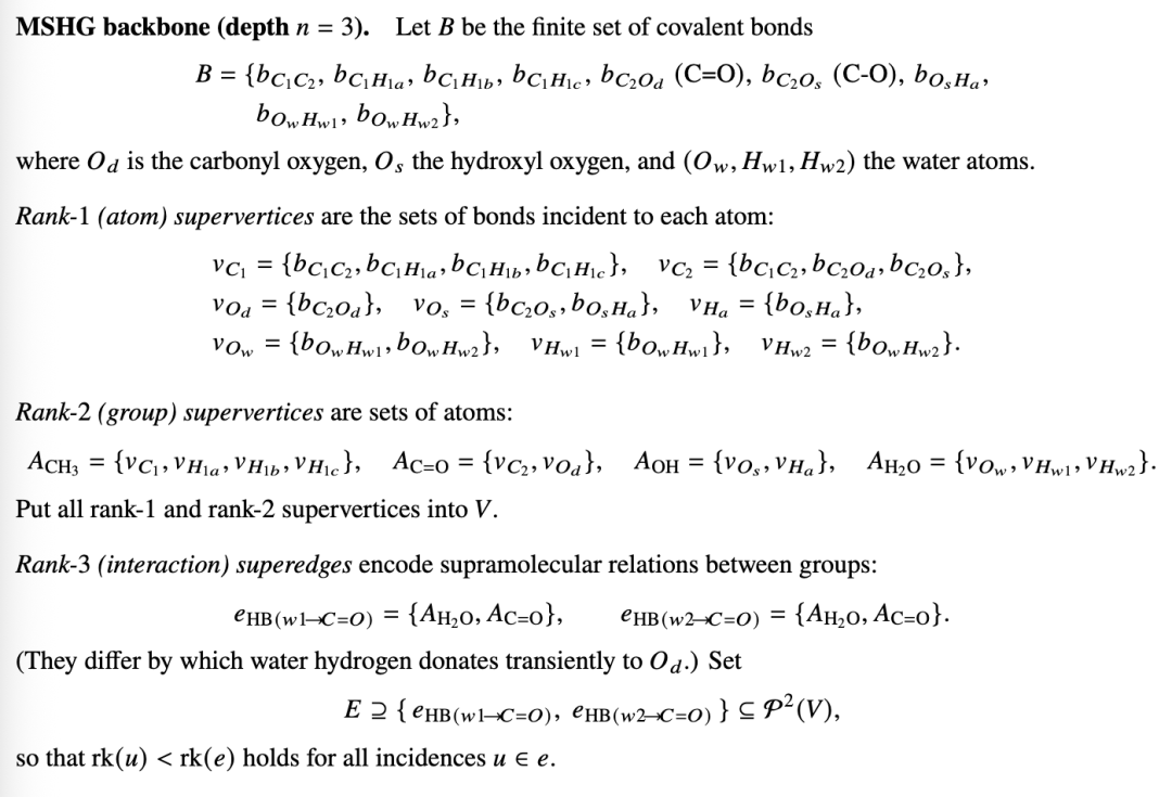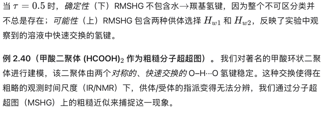 由于供体/受体角色快速交换且两个单体不可区分,无法确定地断言任何单一的定向氢键(下RMSHG不包含任何氢键)。然而,两种定向氢键超边都是可能的(上RMSHG包含两者),这忠实地反映了真实环状二聚体的对称、动态变化的氢键网络。