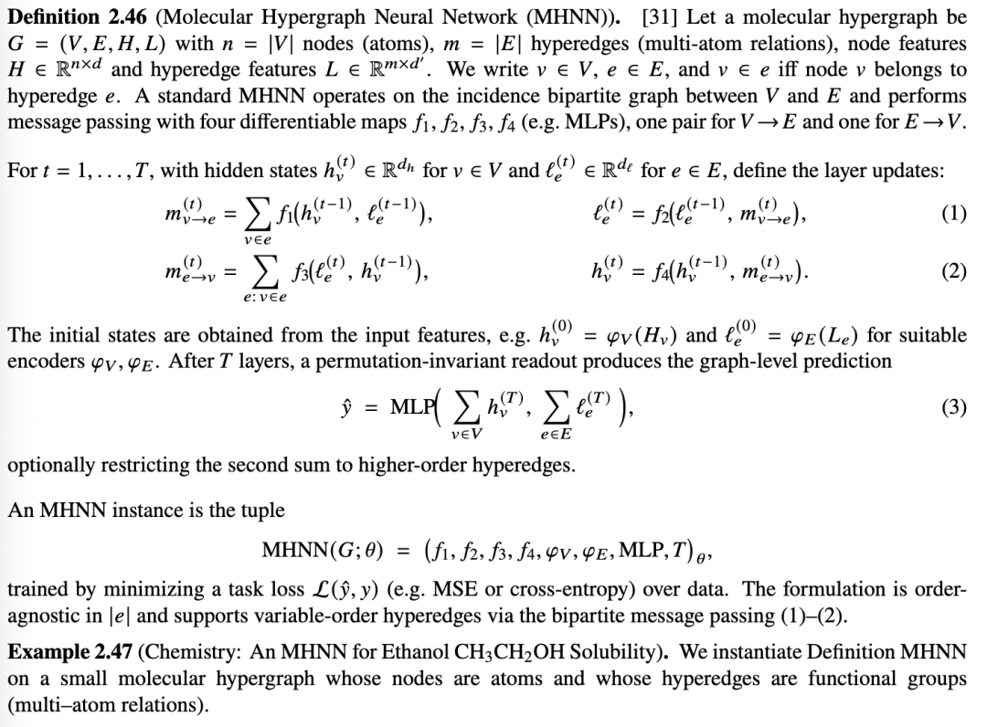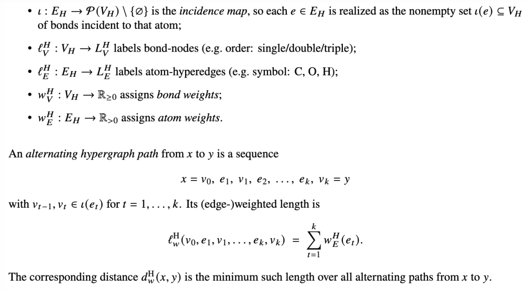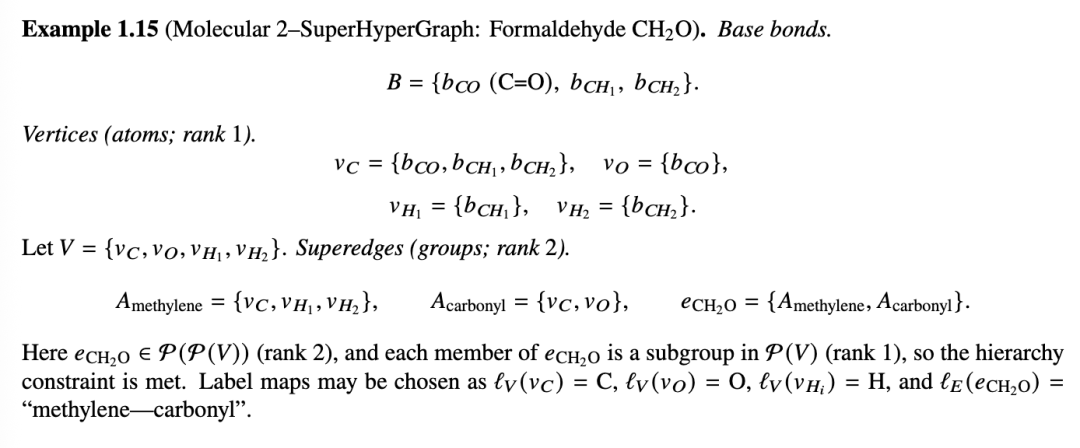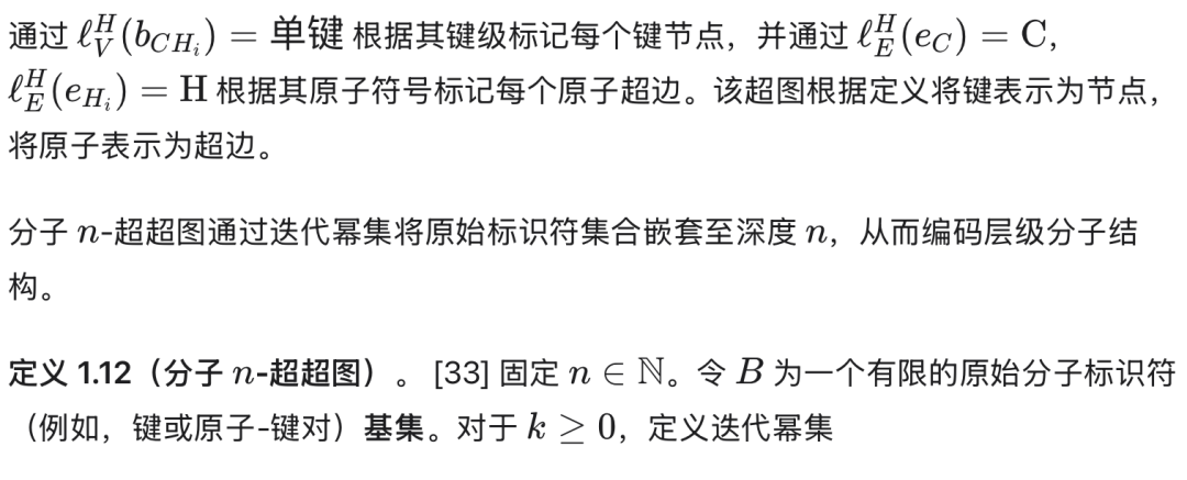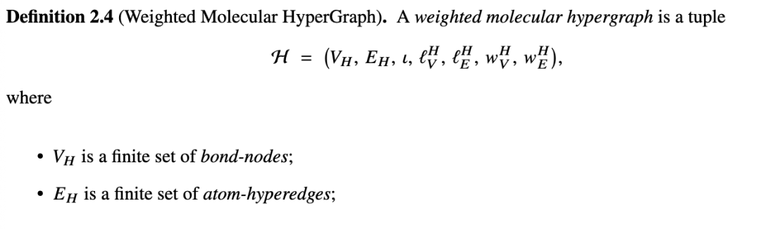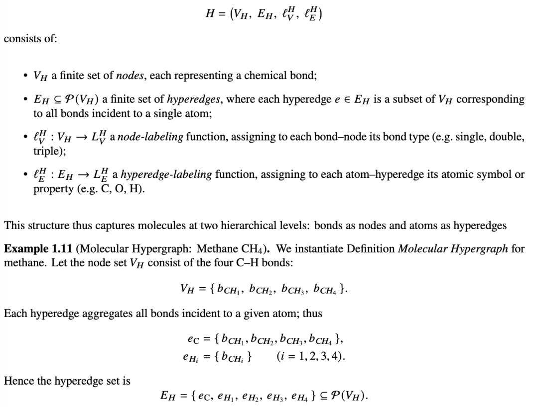 定义 1.10(分子超图)。[33] 分子超图是一个节点和超边标记的超图,用于建模分子的原子和键合结构。形式上,一个分子超图: