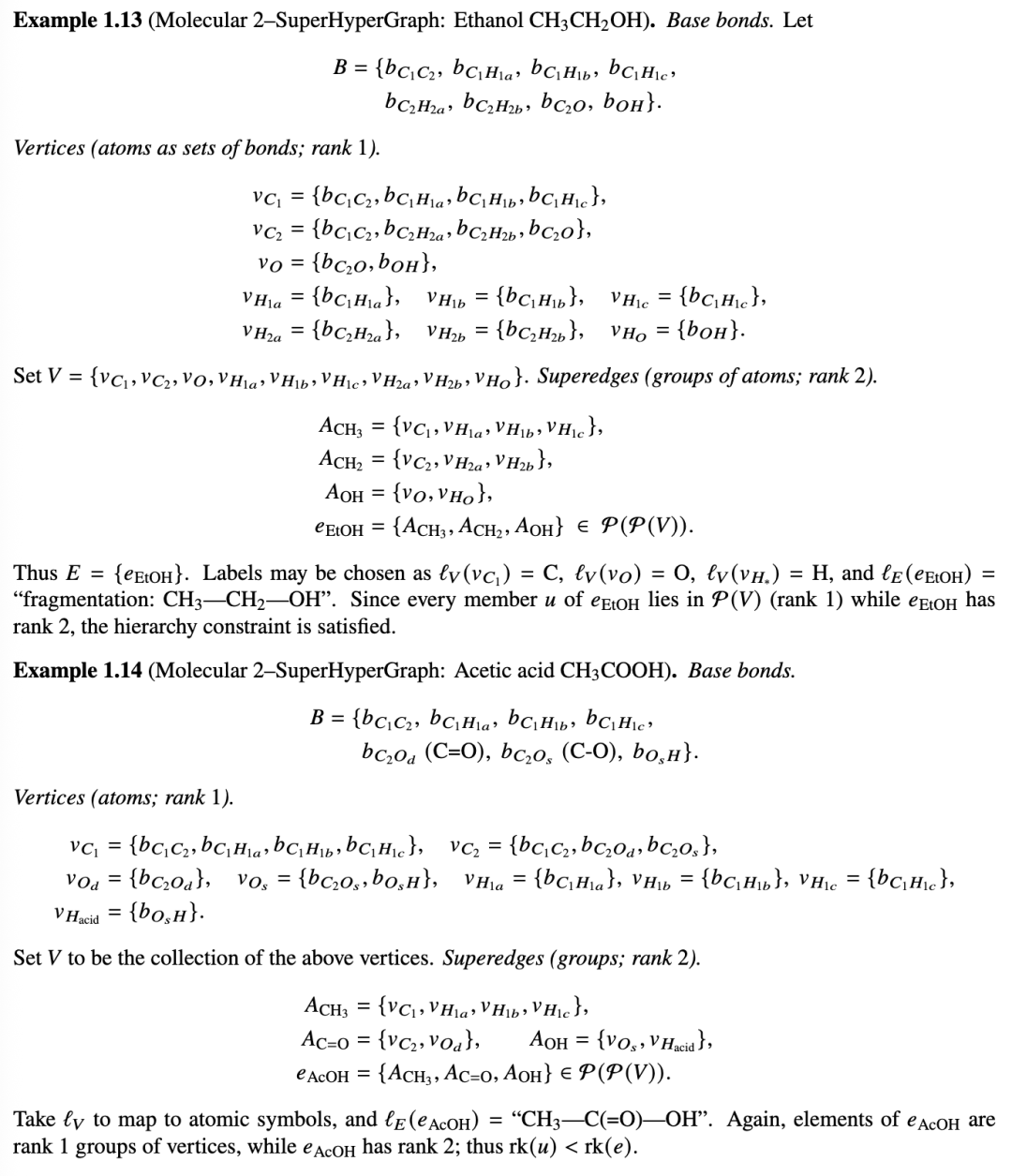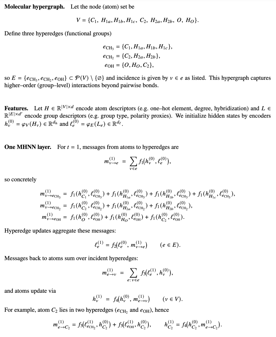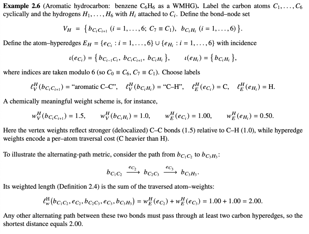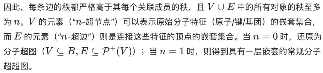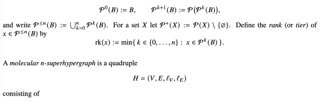 定义 1.10(分子超图)。[33] 分子超图是一个节点和超边标记的超图,用于建模分子的原子和键合结构。形式上,一个分子超图: