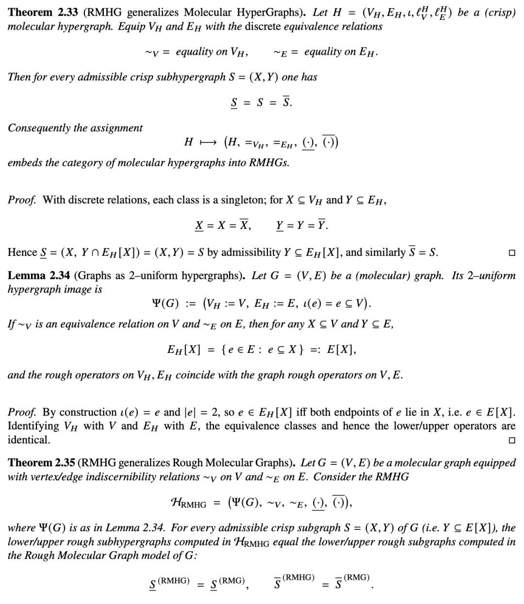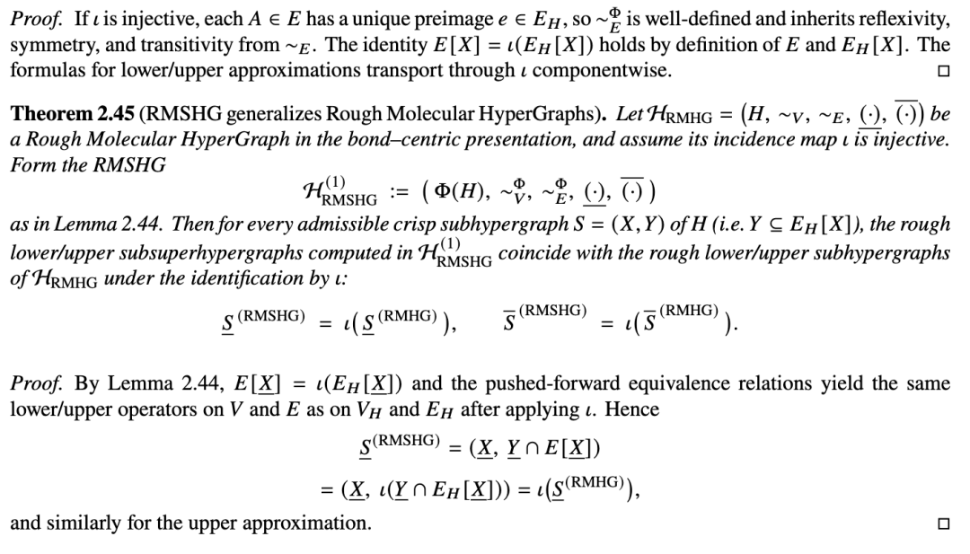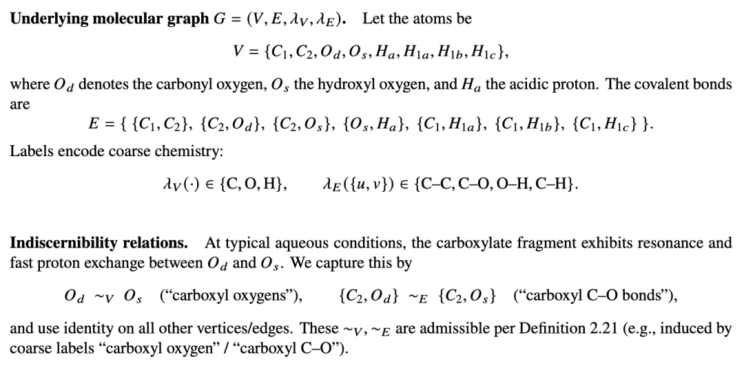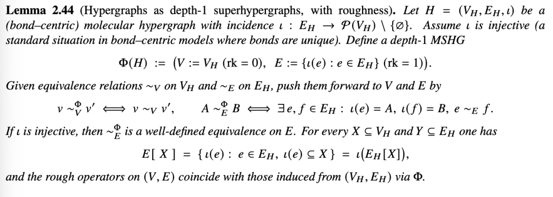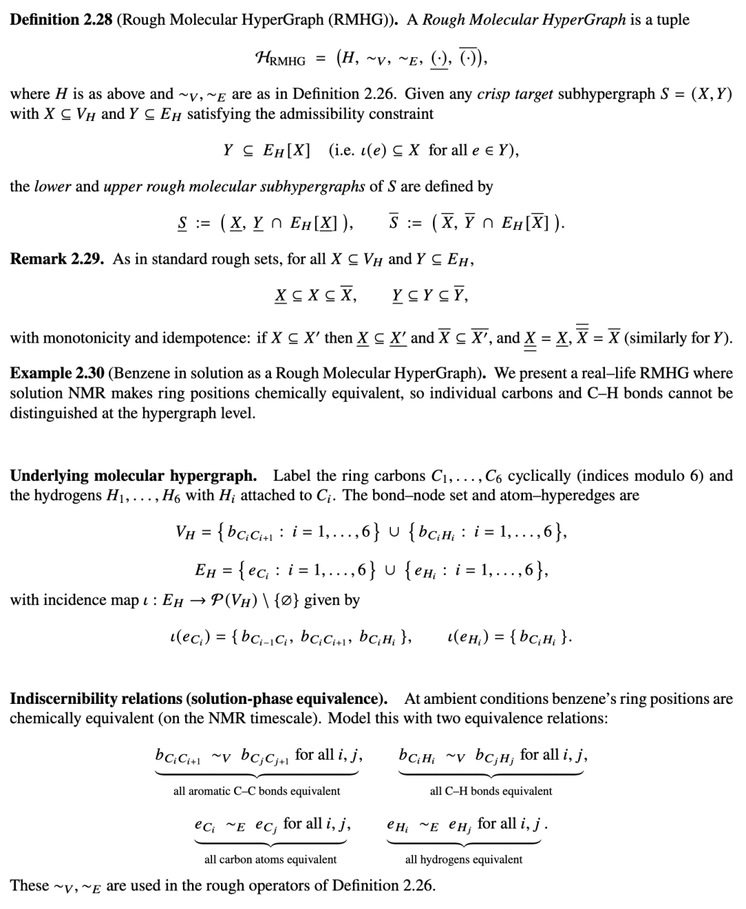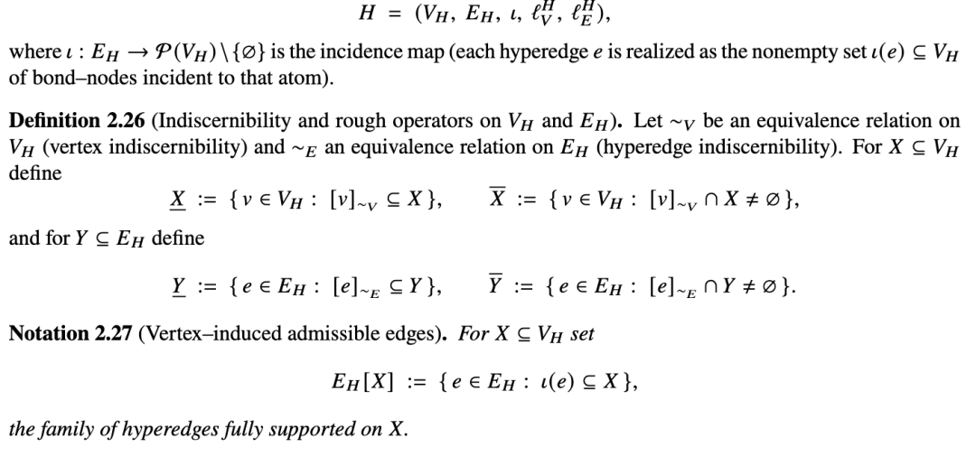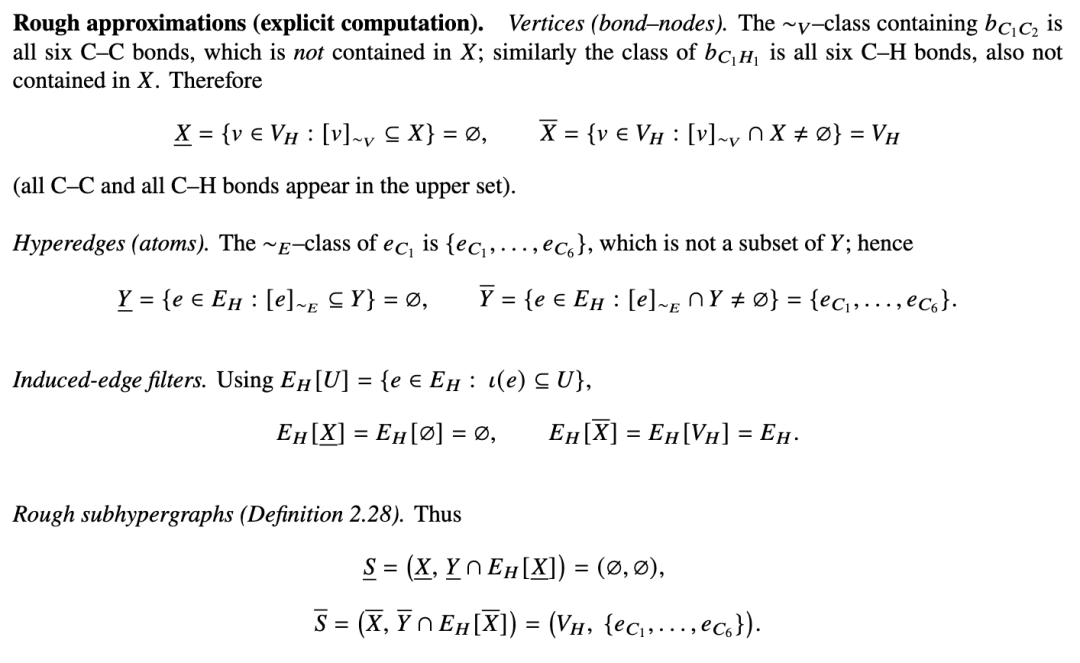 我们将粗糙近似提升到分子超图层面,允许在键(在以键为中心的表述中即为超图顶点)和原子(即超边)上存在不可分辨性。全文中,我们基于一个固定的分子超图