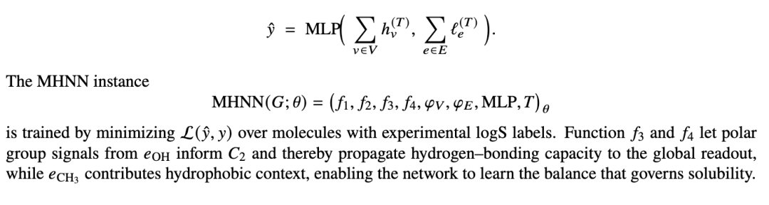 预测与任务。经过 T 层后,一个置换不变的读出产生一个图级表示,用于诸如水溶性 (logS) 等性质: