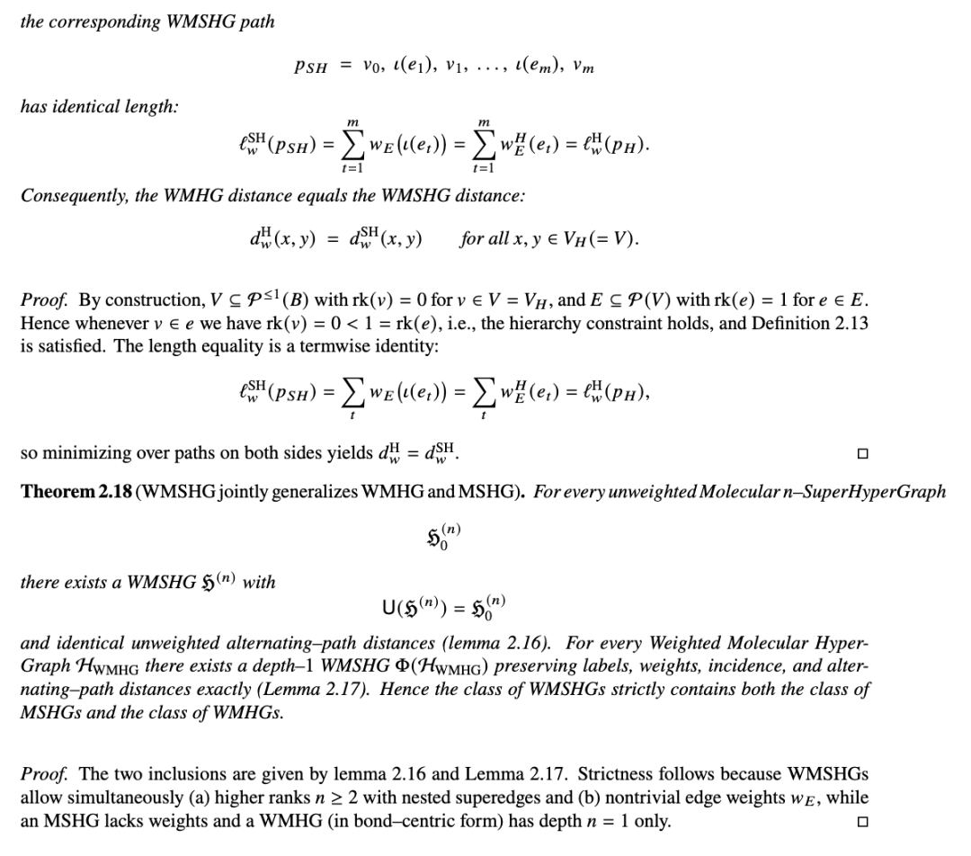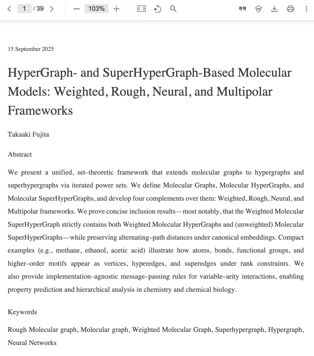 我们提出了一个统一的集合论框架,通过迭代幂集将分子图扩展为超图和超超图。我们定义了分子图、分子超图和分子超超图,并在其上开发了四种补充框架:加权、粗糙、神经和多极框架。我们证明了简洁的包含关系结果——最值得注意的是,加权分子超超图严格包含加权分子超图和(未加权的)分子超超图——同时在规范嵌入下保持交替路径距离。简洁的示例(例如,甲烷、乙醇、乙酸)说明了原子、键、官能团和高阶模体如何在秩约束下作为顶点、超边和超超边出现。我们还提供了用于可变元相互作用的与实现无关的消息传递规则,使得化学和化学生物学中的性质预测和层次分析成为可能。