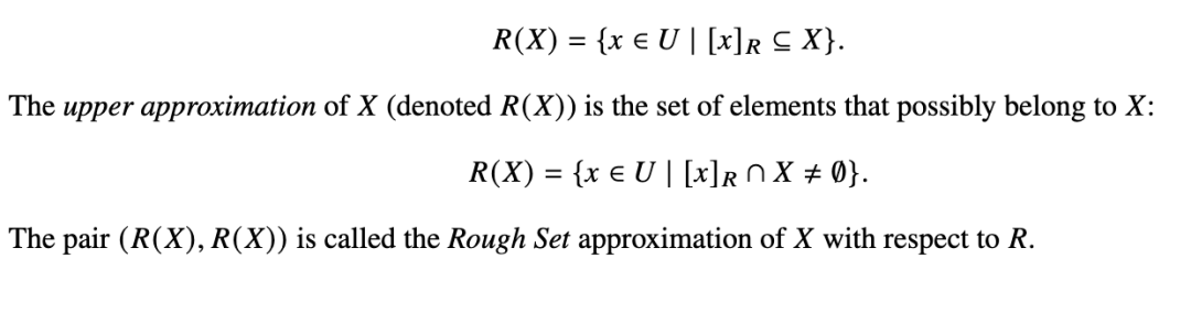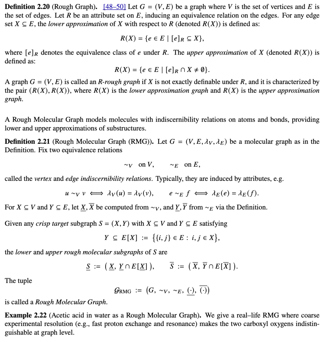 粗糙集(Rough Set)提供了一种数学工具,通过近似元素集合来处理不确定信息 [40–42]。粗糙图(Rough Graph)将粗糙集理论扩展到图中,其中关系(边)的不确定性通过下近似和上近似来表示 [43–45]。