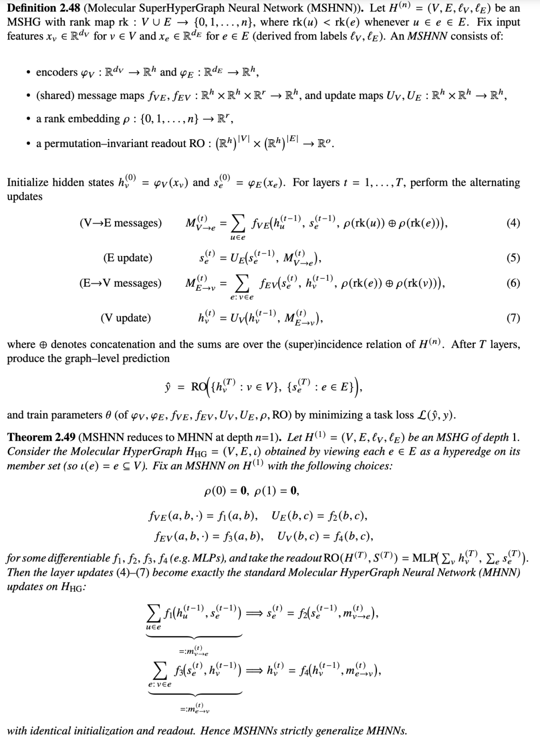分子图神经网络是在图上运行的深度学习框架,其中原子被视为顶点,化学键被视为边,使得能够通过迭代消息传递来学习分子性质 [51–55]。分子超图神经网络将这一思想扩展到超图,其中超边同时连接多个原子,允许模型捕捉比普通图更高阶的化学相互作用和更复杂的结构基元 [31, 56, 57]。