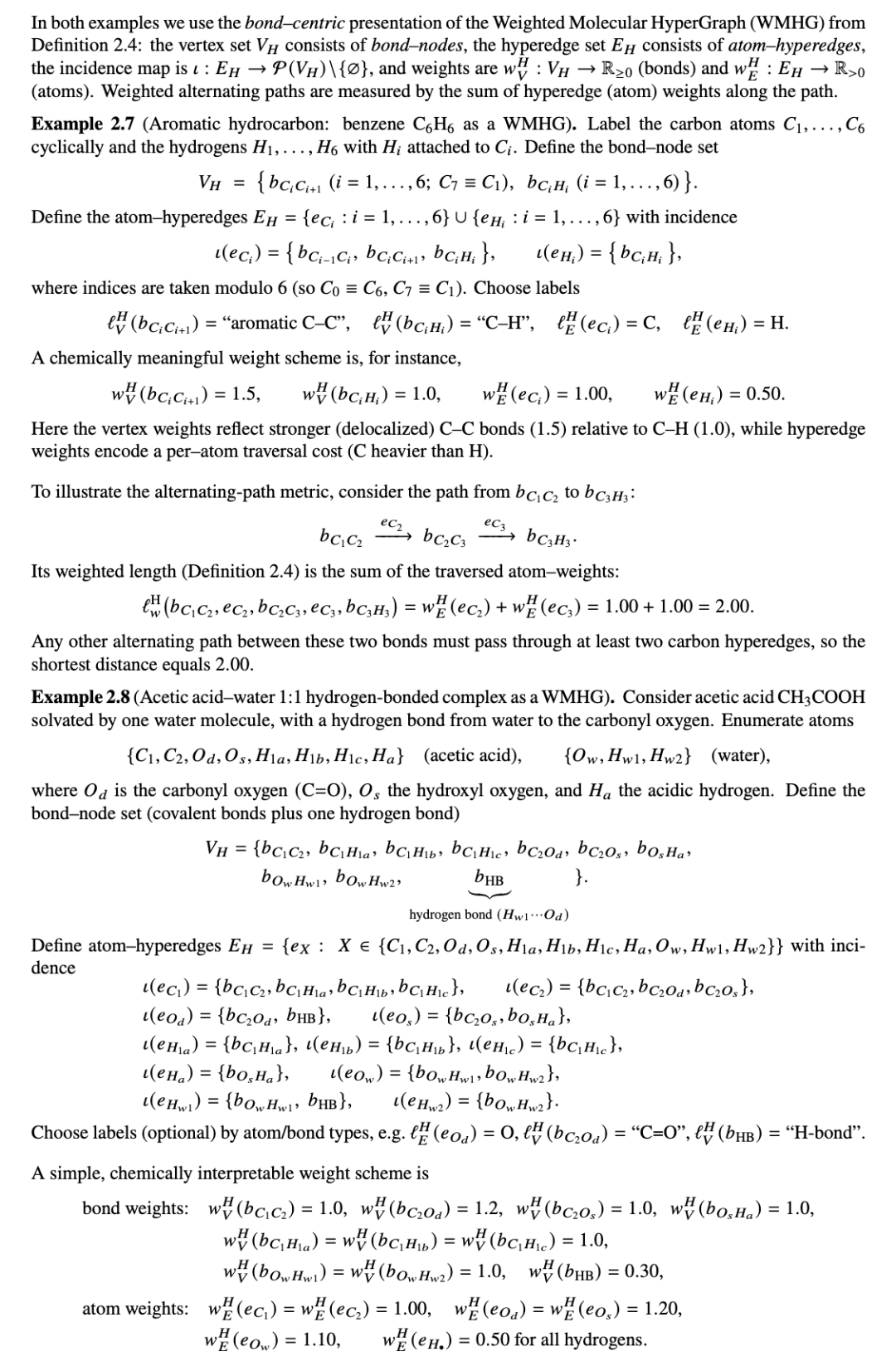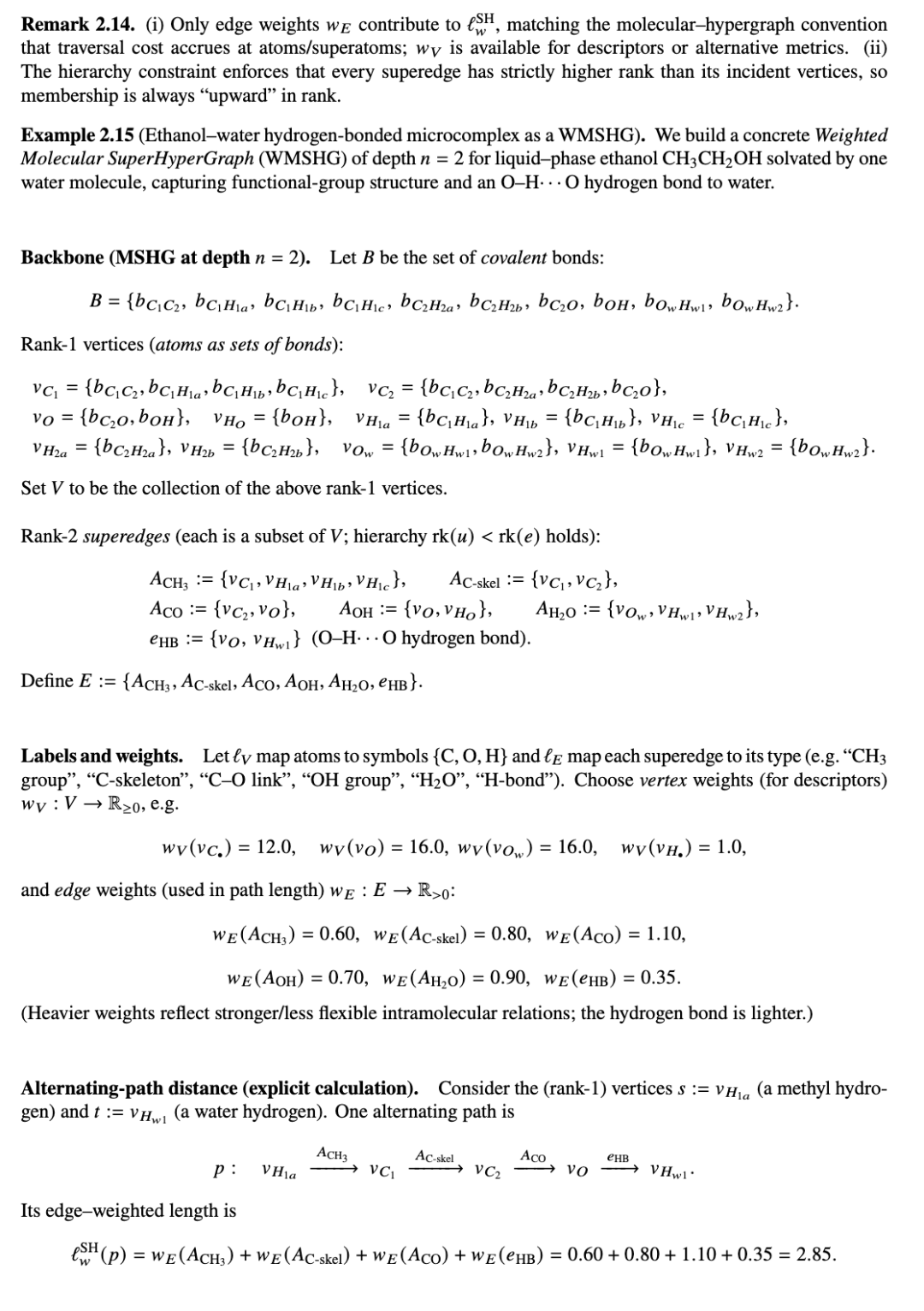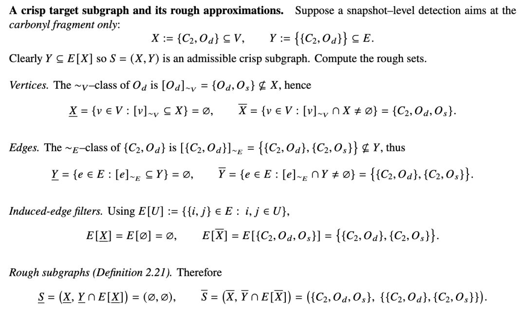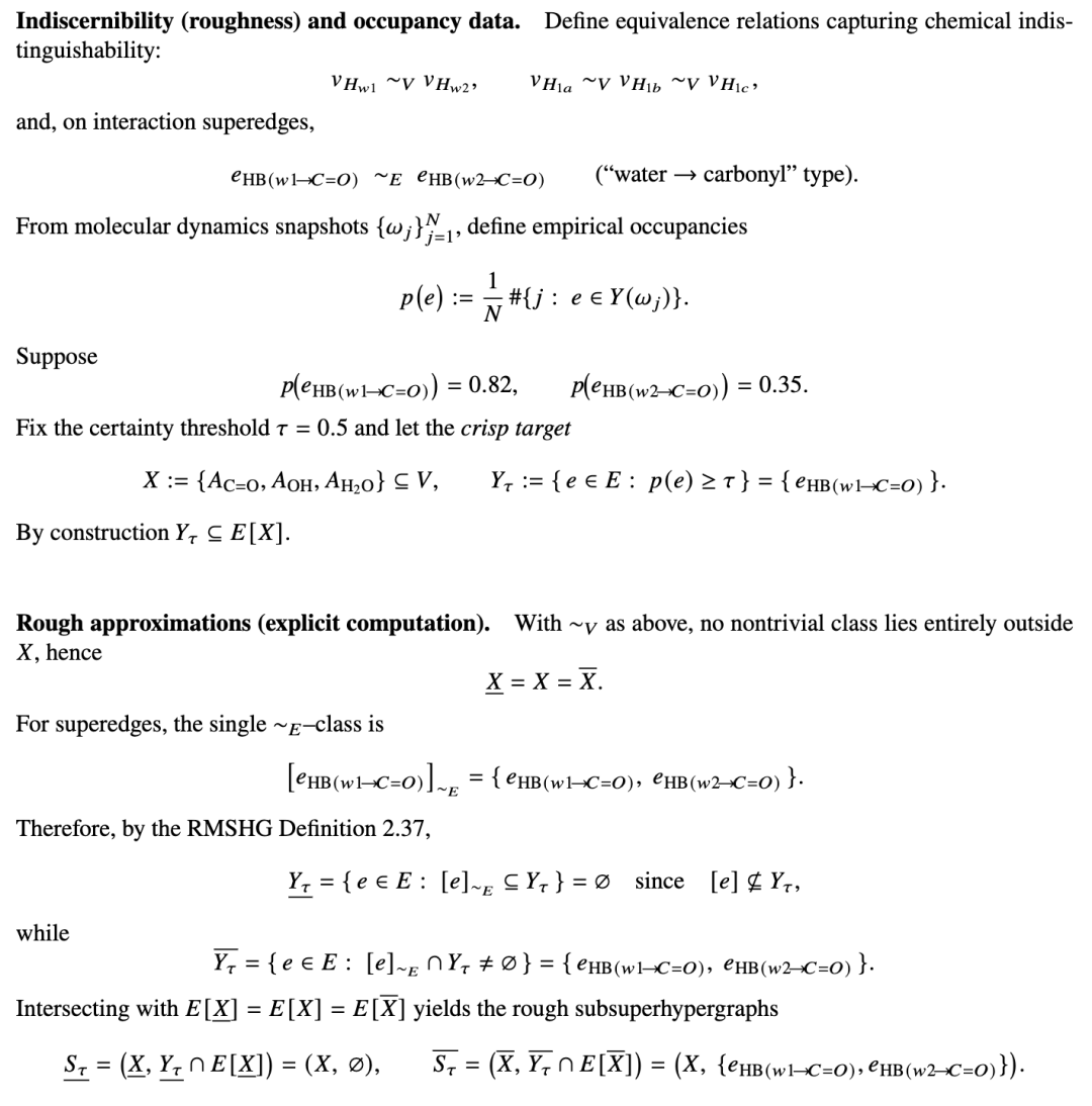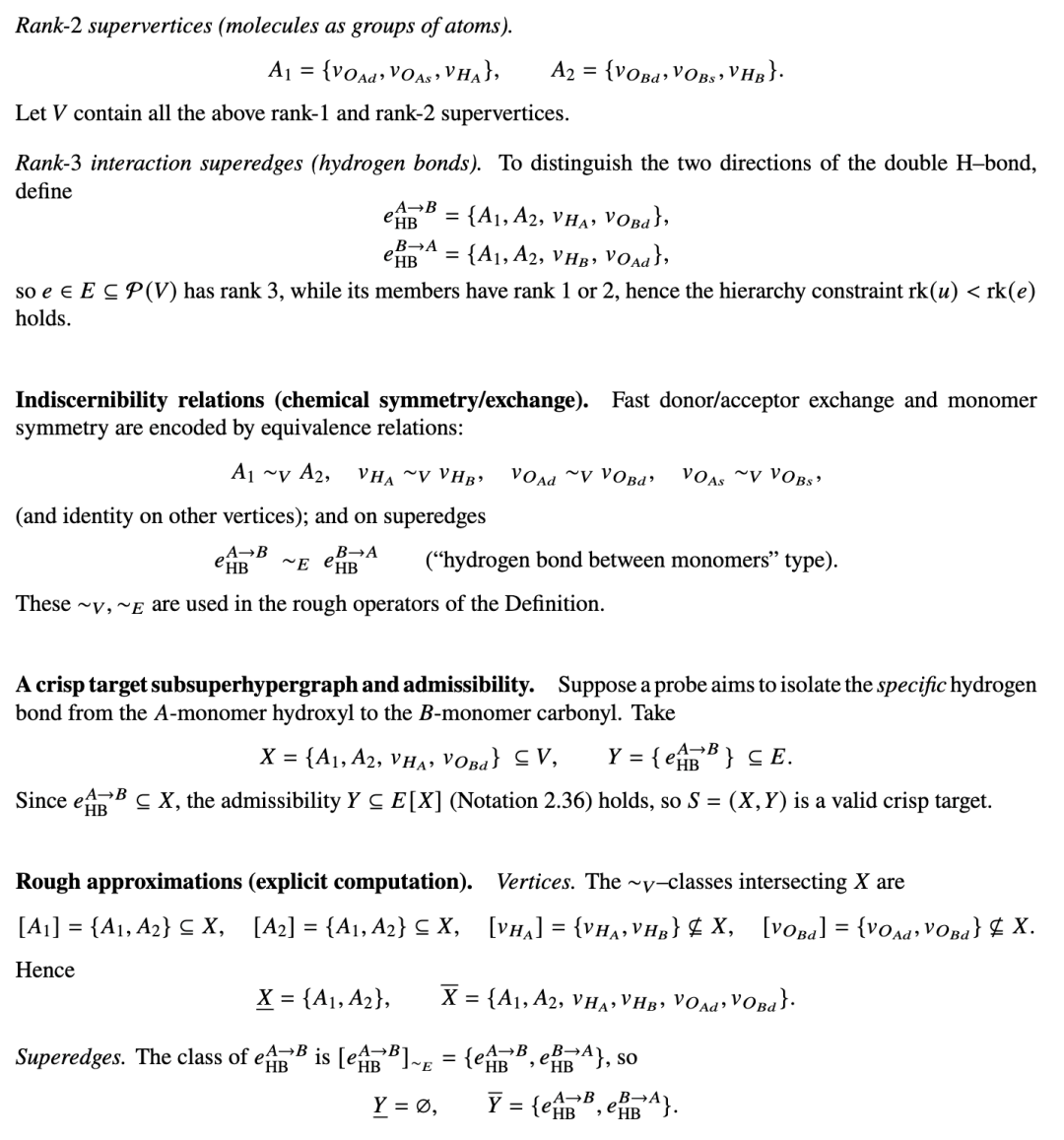 例 2.39(乙酸 - 水氢键作为一种 RMSHG)。我们展示了一个具体的实际粗糙分子超超图(RMSHG),它构建于带有一个水分子的溶剂化乙酸 CH3COOH 之上。氢键随机地形成和断裂;我们通过粗糙(下/上)近似来捕捉这种不确定性。