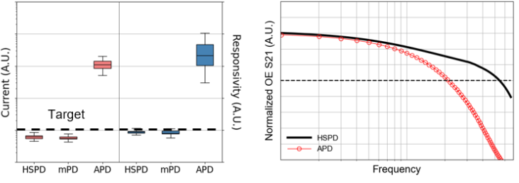 平台基于锗材料开发了全系列光电探测器件,包括 HSPD、mPD 与雪崩光电二极管(APD),实现了从常规探测到高灵敏度探测的全覆盖。HSPD 与 mPD 在 - 1 V 偏置电压下,暗电流均低于 10 nA,响应度接近 1 A/W,兼顾低噪声与高探测效率;针对高灵敏度需求设计的 APD,在 - 1 V 偏置下暗电流约 1 μA,响应度超 3 A/W,光电 S21 3-dB 带宽达 20 GHz,而 HSPD 的光电 S21 3-dB 带宽则高达 50 GHz,满足高速光信号的探测需求。