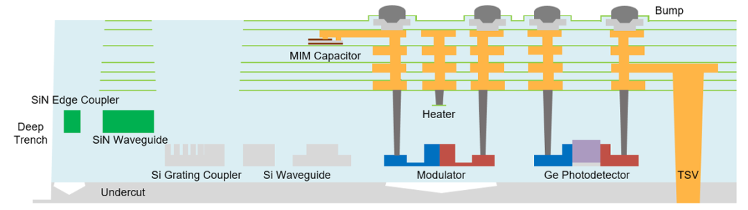 在热调控与系统集成层面,平台集成带掏空选项的钨(W)加热器,为热光移相器提供高效的温度调控能力,解决光子器件的温度敏感性问题;将金属 - 绝缘体 - 金属(MIM)电容集成至四层金属层的 BEOL 工艺中,保障系统的电源完整性。同时,平台集成硅通孔(TSV)与凸点结构,实现与电子集成电路(EIC)、中介层、封装基板及印刷电路板(PCB)的外部互连,为共封装光学(CPO)等先进封装方案提供硬件支撑,打通光子器件从芯片到系统的连接链路。
