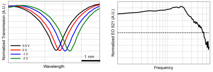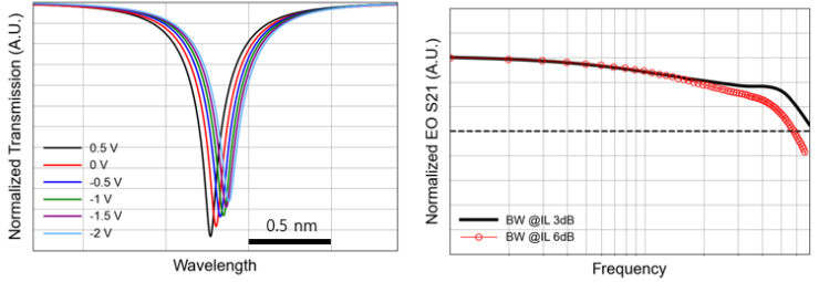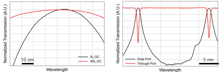 此外,平台开发的双环滤波器(DRF)drop-port 插入损耗小于 1.0 dB,1-dB 带宽达 105 GHz,为波长选择与信号滤波提供了高性能解决方案。