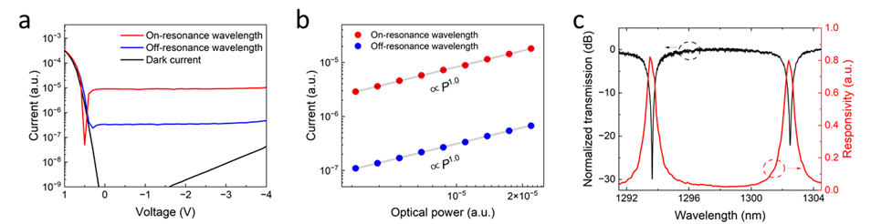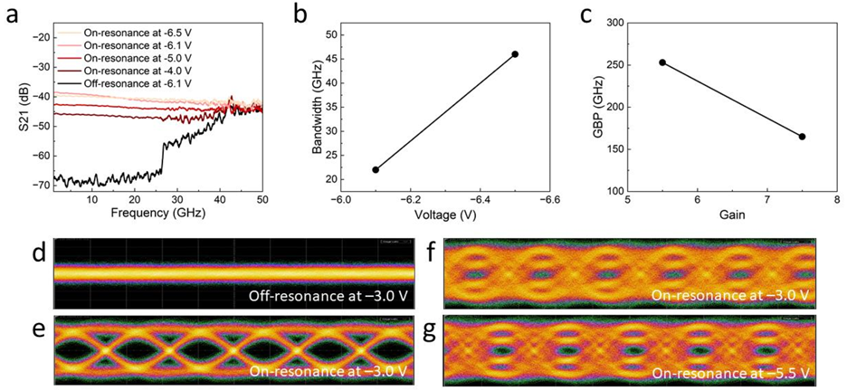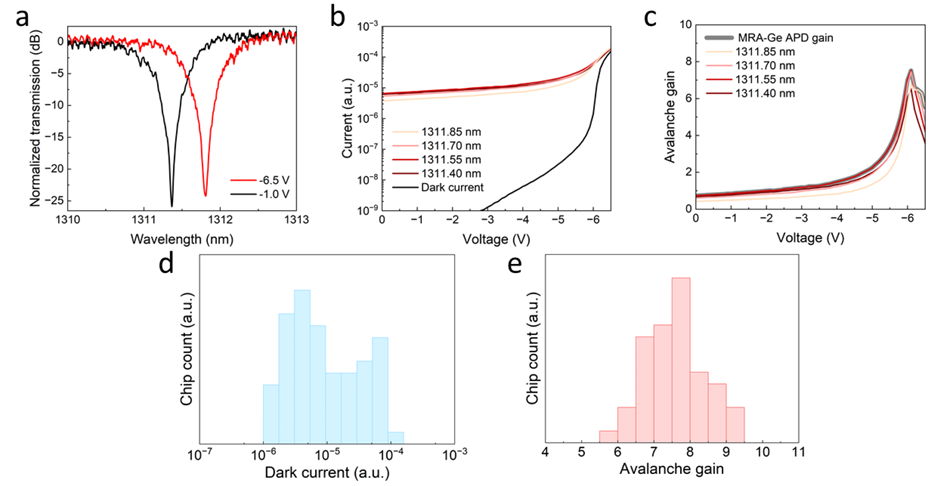 性能方面,在 - 1.0 V 偏置下,MRA-Ge APD器件在谐振波长处的响应度达 0.82 A/W,非谐振波长处响应度降低一个数量级,串扰约 10 dB;在低至 - 6.1 V 的偏置电压下实现 7.5 倍的雪崩增益,且在 300mm 晶圆上展现出良好的暗电流与雪崩增益均匀性。其光电带宽在 - 6.1 V 时为 22 GHz,-6.5 V 时提升至 46 GHz,增益带宽积(GBP)分别达 165 GHz 与 253 GHz,为低电压、高灵敏度的高速光探测提供了潜在解决方案。