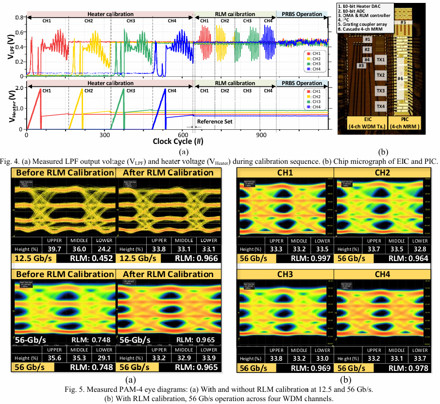 测试结果显示,该校准技术有效解决了 PAM4 电平失衡问题:校准前 12.5 Gb/s 与 56 Gb/s 速率下 RLM 分别仅为 0.452 与 0.748,校准后提升至 0.966 与 0.965 以上;四通道均实现 56 Gb/s 的 PAM4 信号传输,聚合吞吐量达 224 Gb/s,且各通道性能均匀,成为业界首个实现片上同时锁定 OMA 与优化 RLM 的 WDM 发射器,适配 CPO 等高密度封装的光互连应用。