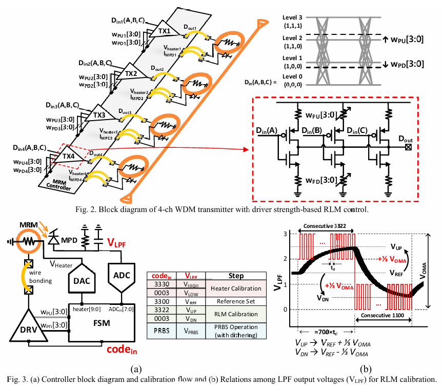 基于平台的 MRM 核心器件,三星联合延世大学在 OFC 2026 发布了 224-Gb/s 硅光子 WDM 发射器,针对 MRM 谐振特性对温度敏感、光学调制幅度(OMA)峰值与 PAM4 线性度(RLM)最优条件不匹配的行业痛点,提出代码控制的双目标校准技术,实现了 OMA 锁定与 RLM 优化的片上同步完成,无需外部数字信号处理(DSP)或现场可编程门阵列(FPGA),为高密度 WDM 光发射模块提供了低复杂度、高稳定性的解决方案。
