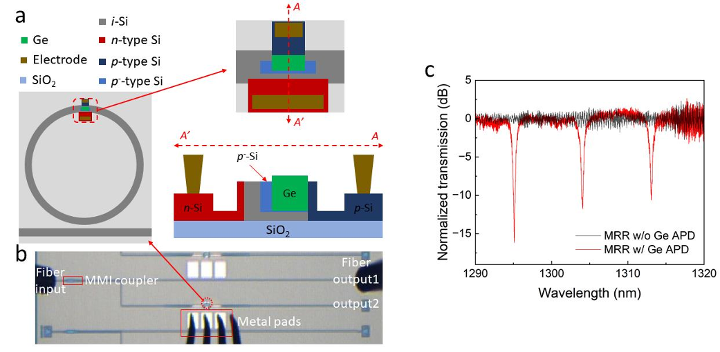 在此基础上,三星进一步在该平台开发出 MRA-Ge APD,解决了传统 APD 高工作电压与 HPC 低功耗需求的矛盾。该器件将 7 μm 半径的微环谐振器(MRR)与 180 nm×400 nm 沟槽的选择性外延锗层集成,采用横向分离吸收、电荷和倍增(SACM)结构,锗区面积达亚 μm² 级别。
