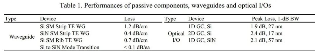 无源器件作为光信号传输的基础,其损耗与带宽直接决定光互连链路的整体性能。三星该平台的硅单模 TE 条形波导、SiN 单模 TE 条形波导与硅单模 TE 脊形波导的传播损耗分别低至 1.2 dB/cm、0.4 dB/cm 与 0.7 dB/cm,实现了光信号的低损耗长距离传输;硅与 SiN 波导间的 TE 模式转换损耗小于 0.1 dB,为不同波导结构的集成提供了低损耗衔接方案。