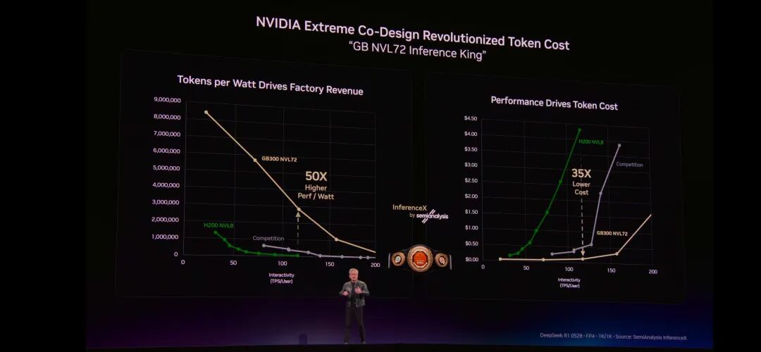 ◆从Hopper H200到Grace Blackwell,摩尔定律预期能带来约1.5倍的提升,但实际提升达到35倍的每瓦性能(Semianalysis分析有50倍),实现了全球最低的token成本。
