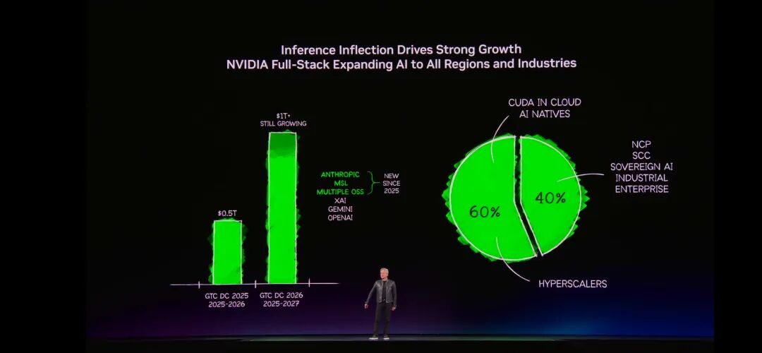 ◆去年GTC上,老黄看到了至2026年、对Blackwell和Rubin约5000亿美元的高可信度需求。今年的GTC可以清晰地看到:至少到2027年,需求将达到1万亿美元。而且实际计算需求将远高于此。
