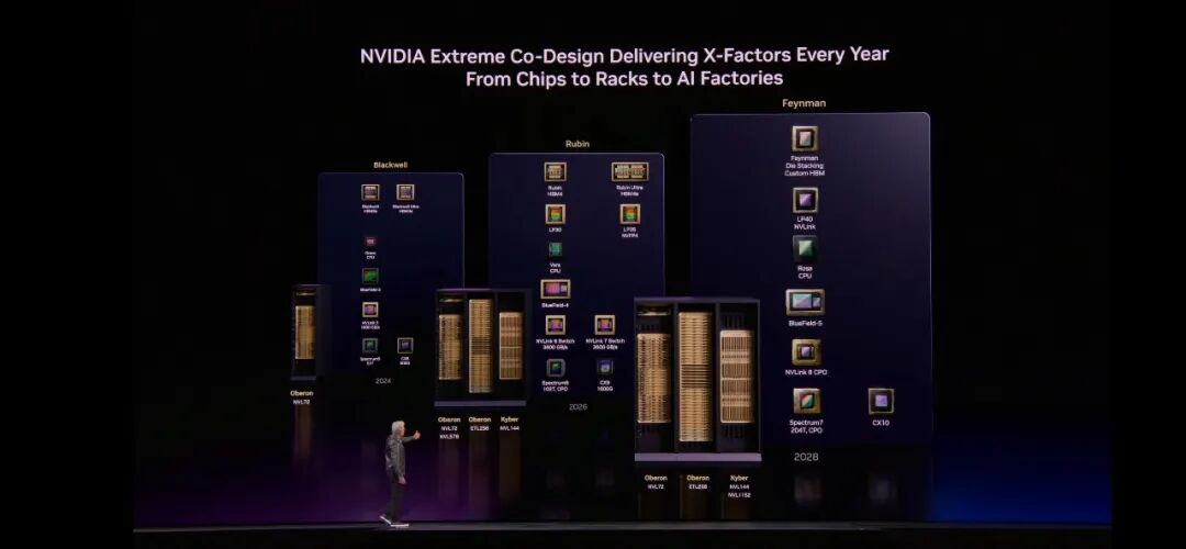 Feynman将搭载全新 CPU——Rosa,以罗莎琳德·富兰克林命名。正是她的 X 射线晶体学研究揭示了 DNA 结构,重塑了现代生物学。正如富兰克林揭开了生命隐藏的结构,Rosa 旨在全面调度智能体 AI 工作负载的完整结构——在 GPU、LPU、存储和网络之间高效调度数据、工具与 Token。黄仁勋介绍,Rosa 支撑起一个全新平台,搭配英伟达下一代 LPU LP40、BlueField-5、CX10,通过英伟达 Kyber 实现铜缆与共封装光学的横向扩展,并通过英伟达 Spectrum 级光互联实现纵向扩展。这也是第一次将光引入到scale up域。("We will have Kyber, which is copper scale up. We will also have Kyber CPO scale up.So for the first time, we will scale up with both copper and co-package optics")。整体而言,Feynman 一代将全面升级 AI 工厂的每一根支柱:计算、内存、存储、网络与安全。