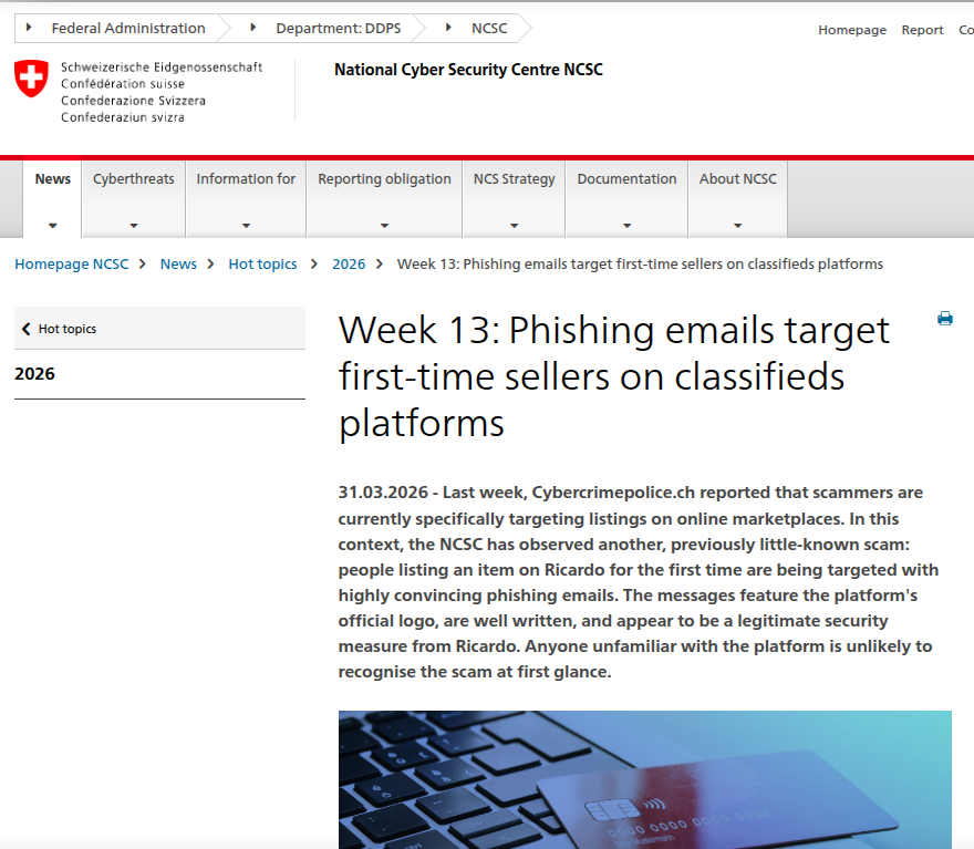 网络钓鱼已从广谱群发转向垂直场景、精准目标、定制话术的高阶演化形态,二手交易与分类信息平台因交易频次高、资金敏感、用户群体广泛,成为攻击高发领域。2026 年 3 月 31 日,瑞士国家网络安全中心(NCSC)联合网络犯罪警务部门发布专项预警:针对 Ricardo 平台首次上架商品的个人卖家的定向钓鱼攻击呈规模化爆发,攻击者依托平台公开数据锁定新手用户,以账号安全核验、首次交易强制验证为诱饵,实施高仿真欺诈,受害者多因缺乏平台使用经验与安全辨识能力而沦陷。