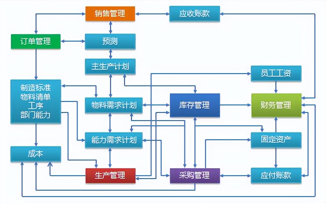 - 飞跃:ERP将管理的范围从制造端扩展到了整个企业。它整合了财务、人力资源、供应链管理(采购、销售、库存)、项目管理、售后服务等几乎所有企业职能。
