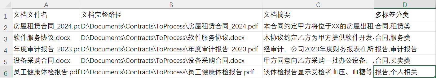 文档房屋租赁合同_2024.pdf处理完成,摘要: 本合同约定甲方将位于XX的房屋出租给乙方,租期1年,月租金5000元。...,标签: 合同,租赁类 文档软件服务协议.docx处理完成,摘要: 本协议约定乙方为甲方提供软件开发与维护服务,服务期6个月。...,标签: 合同,服务类 文档年度审计报告_2023.pdf处理完成,摘要: 经审计,公司2023年度财务报表在所有重大方面公允反映经营成果。...,标签: 报告,审计报告 文档设备采购合同.docx处理完成,摘要: 甲方同意向乙方采购一批办公设备,总价人民币12万元。...,标签: 合同,买卖类 文档员工健康体检报告.pdf处理完成,摘要: 该体检报告显示受检者血压、血糖等指标均在正常范围内。...,标签: 报告,个人相关 所有文档处理完成!结果已保存至: D:\AIWorld\test\Batch_Result_Simulated.csv