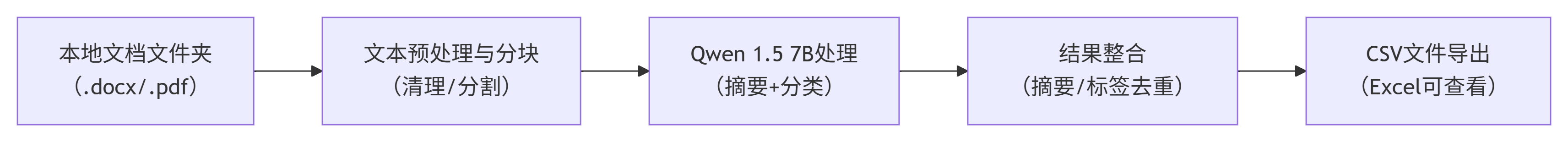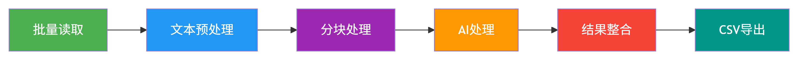 批量文档摘要与分类的核心逻辑是"批量读取→文本预处理→分块→AI处理→结果整合→CSV导出",每一步的作用如下: