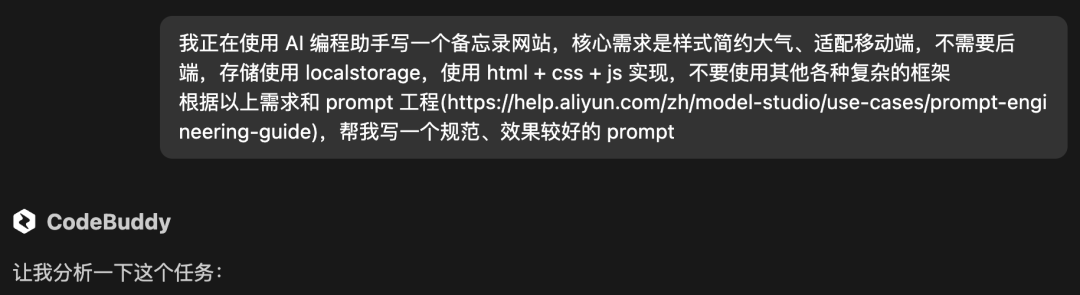 “我正在使用 AI 编程助手写一个备忘录网站,核心需求是样式简约大气、适配移动端,不需要后端,存储使用 localstorage,使用 html + css + js 实现,不要使用其他各种复杂的框架 根据以上需求和 prompt 工程(https://help.aliyun.com/zh/model-studio/use-cases/prompt-engineering-guide),帮我写一个规范、效果较好的 prompt