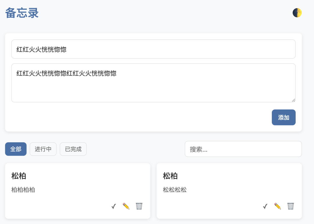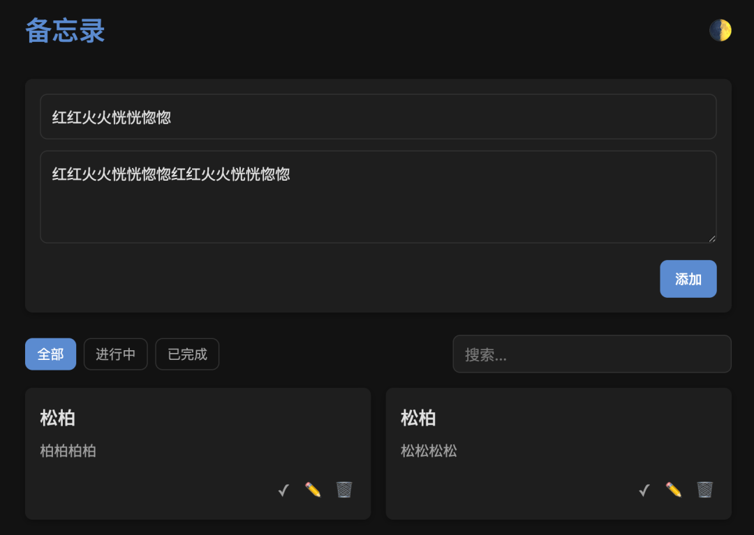 个人感觉效果还不错,拿经典的纯前端实现 todo 清单举例,不到 5 分钟就实现了下面这个效果,甚至还有右上角还能切换黑暗模式~