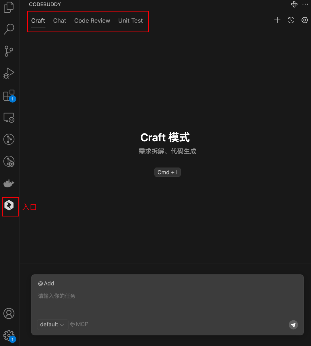 顶部一栏是不同的功能模式,对话(chat)、代码评审(Code Review)、单元测试(Unit Test) 是我们比较熟悉的功能。而 Craft 模式应该是这个插件主打的功能了,也是我们用的最多的功能,类似 Cursor 的 Agent 模式。