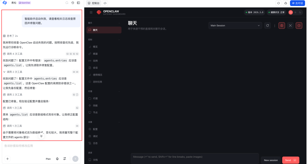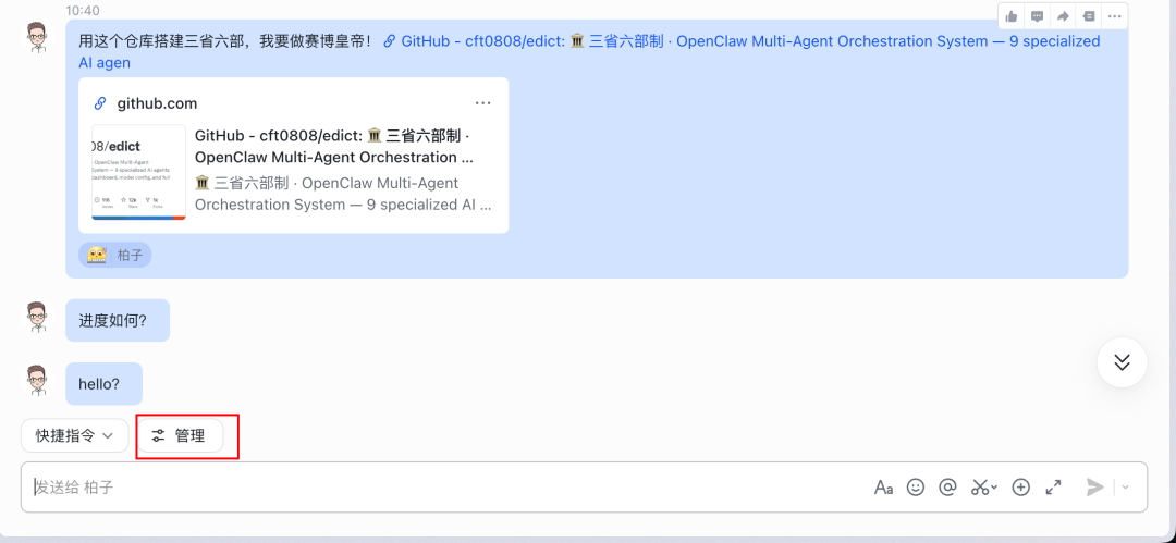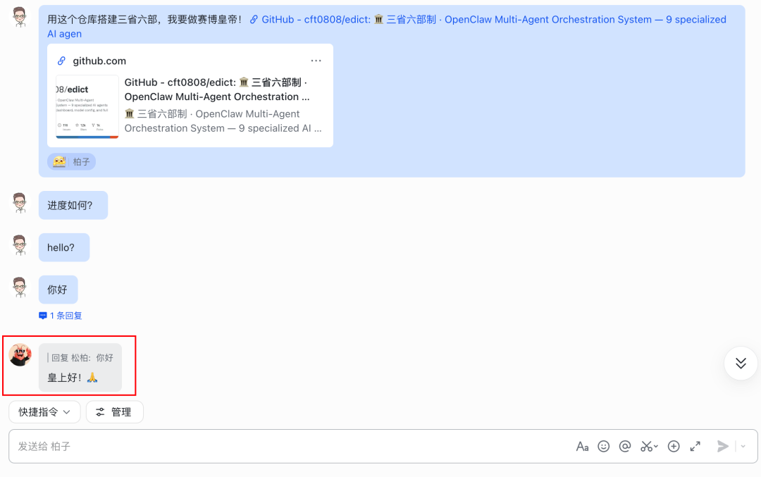修复成功之后,我们的龙虾就回来了。测试的时候它突然来个皇上好我是真没绷住: