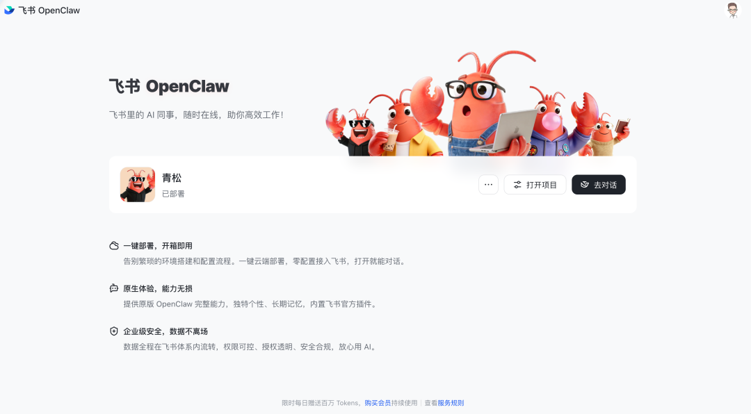 不过想要更省心的话,也可以用飞书的秒搭 https://openclaw.feishu.cn/home: