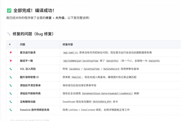 编译完成后,AI 还贴心地给我列出了所有修改项:修复了哪些 Bug、升级了哪些 UI、新增了哪些功能——一目了然。