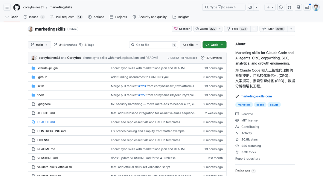这个 marketingskills 开源项目在Github上已经有20k的Star