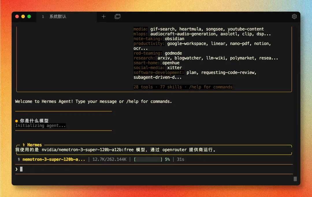 配置完成后运行 hermes 启动,欢迎页,说明一切正常:
