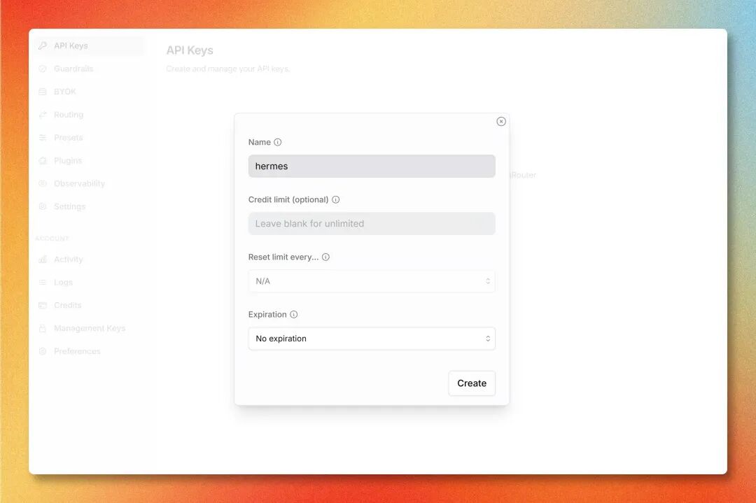 打开,点击 Create Key,名字填 hermes,直接点 Create: