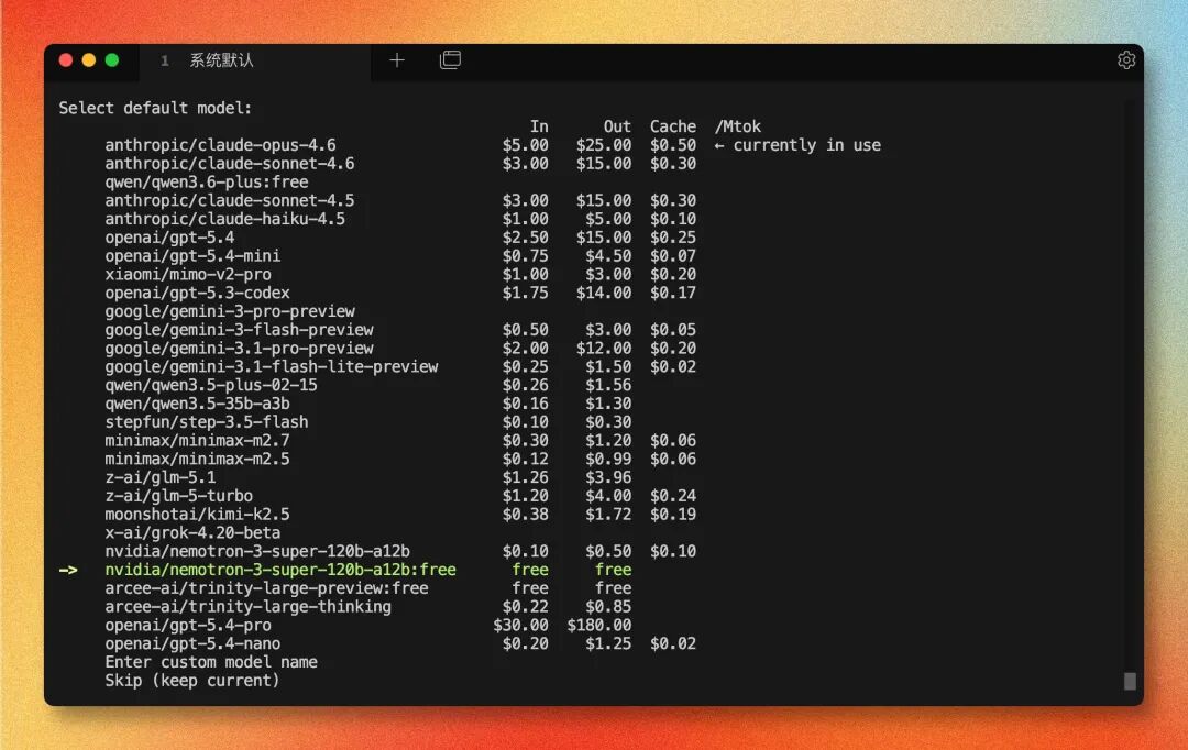 接着选择默认模型。列表里有很多免费模型,这里选 nvidia/nemotron-3-super-120b-a12b:free,完全免费,效果不错:
