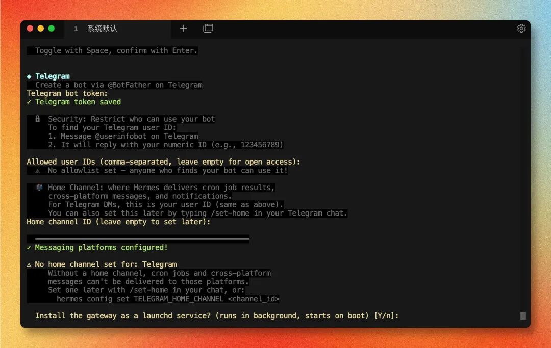 接着设置 Allowed user IDs(填你自己的 Telegram 数字 ID,不填则任何人都能用你的 Bot),Home Channel ID 可以留空后续再配。最后问是否安装为系统服务(launchd),选 Y 可以开机自启、后台常驻: