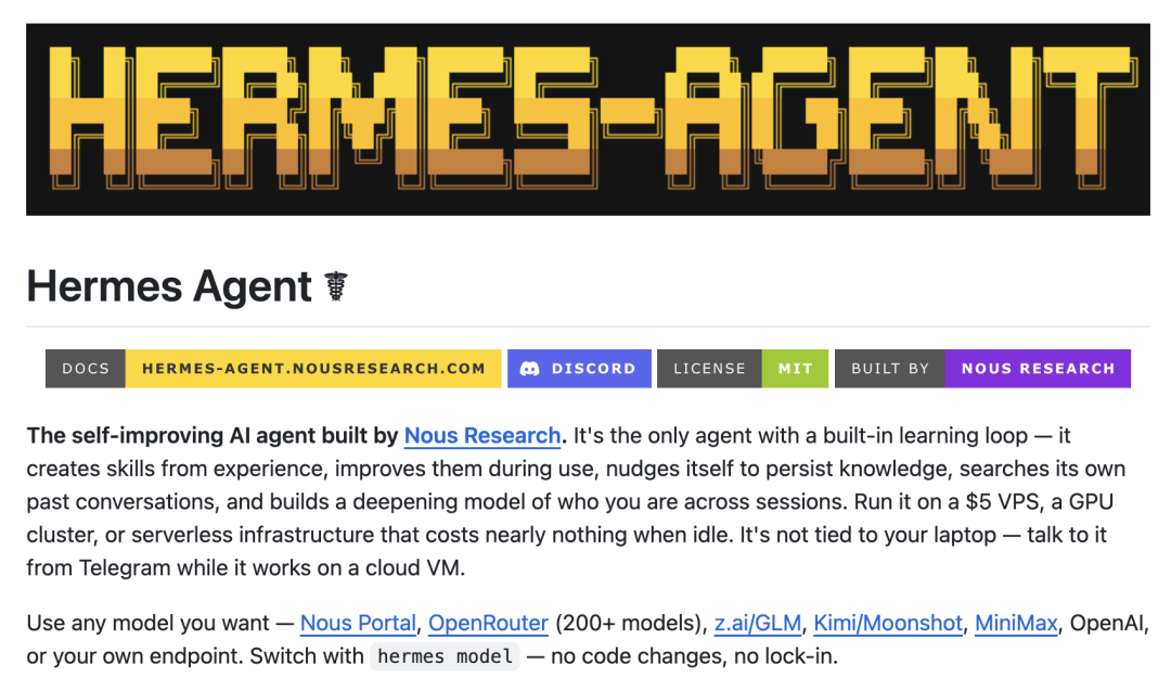 Hermes Agent 是由开放研究团队Nous Research在 2026 年 2 月正式开源的自托管 AI 代理框架。它的口号是“一款能成长的代理”,意味着该代理不仅能完成任务,还能从经验中不断积累方法、优化流程。官方文档指出,Hermes Agent 不只是编程助手或聊天机器人,而是一个能长期运行在你服务器上的自主代理,随着时间推移变得越来越聪明 。