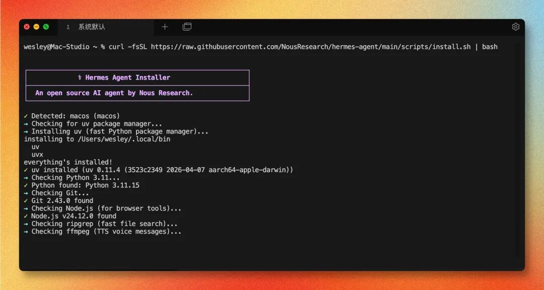curl -fsSL https://raw.githubusercontent.com/NousResearch/hermes-agent/main/scripts/install.sh | bashWindows 环境,在 PowerShell 中输入: