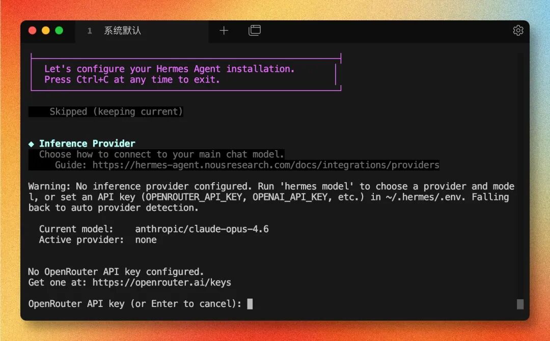 进入 Inference Provider 配置,提示输入 OpenRouter API Key,粘贴提前申请好的 Key 后回车(没有的话先看文末番外):