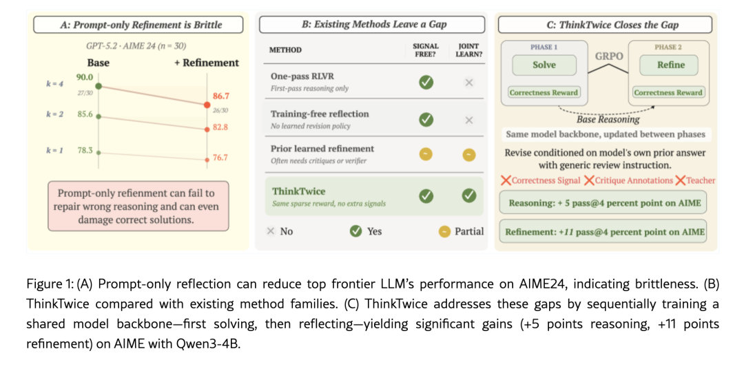 【创新点】ThinkTwice 采用两阶段强化学习加自我反思训练:先让模型完成推理任务,再基于自身解答训练,Qwen3‑4B 的 Pass@4 提高 5 和 11.5 个百分点,训练无需外部正确信号 。