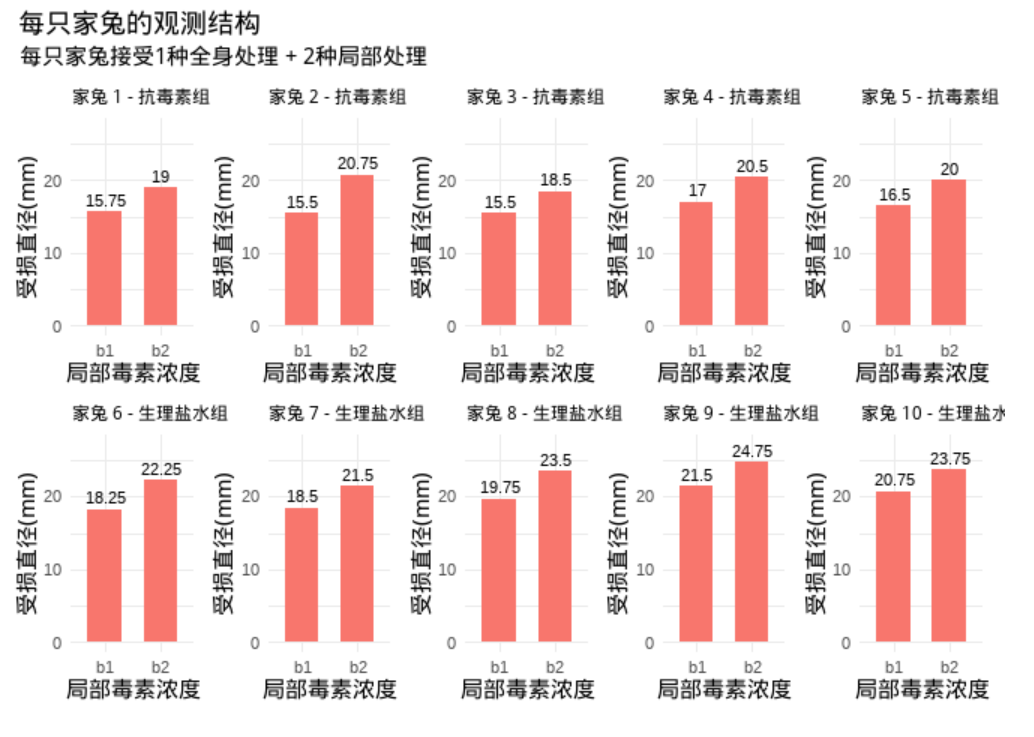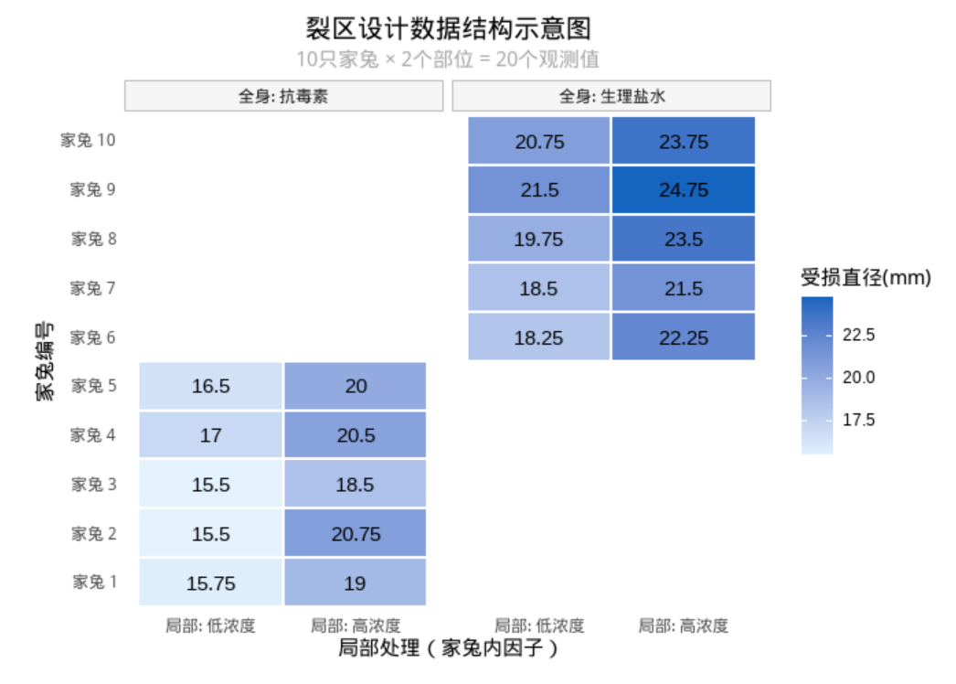subtitle = "10只家兔 × 2个部位 = 20个观测值",
