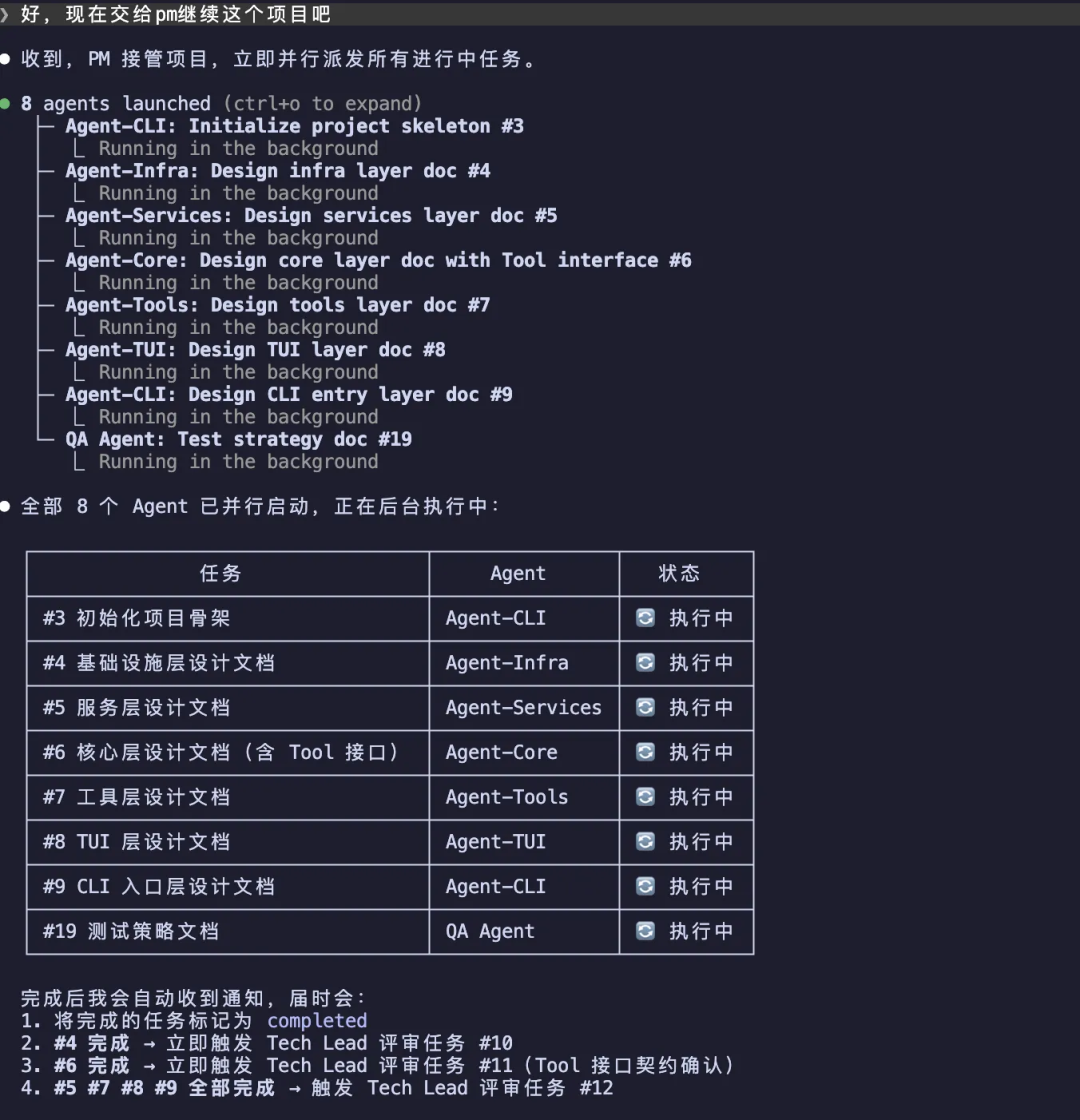 传统做法是按依赖顺序串行——先搭基础设施,再写核心逻辑,最后做UI。但我让所有Agent同时开工。