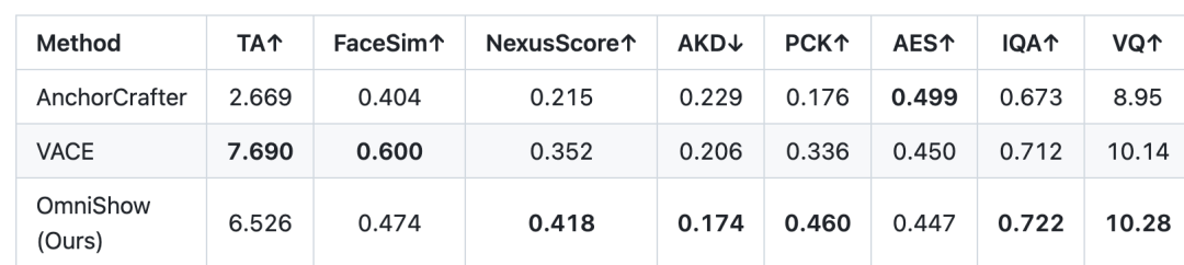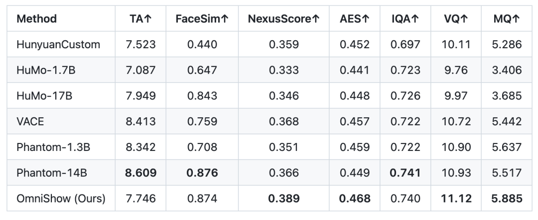 在R2V(参考图像转视频)任务上,OmniShow的NexusScore达到0.389,AES达到0.468,VQ达到11.12,MQ达到5.885,这些指标都是所有对比模型中最高的。虽然TA和FaceSim指标不是最高的,但也非常接近最好的水平。
