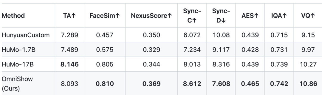 在RA2V(参考图像+音频转视频)任务上,OmniShow的表现更加全面。除了TA和FaceSim指标略低于HuMo-17B外,其他指标包括NexusScore、Sync-C、Sync-D、AES、IQA、VQ、MQ都是最高的。特别是Sync-C和Sync-D这两个音视频同步指标,OmniShow的优势非常明显。