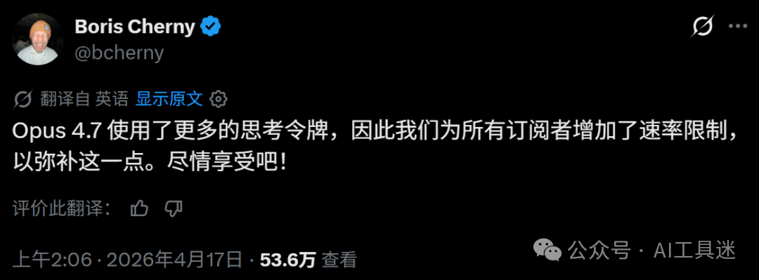 Anthropic 还编写了迁移指南(https://platform.claude.com/docs/en/about-claude/models/migration-guide#migrating-to-claude-opus-4-7),提供了从 Opus 4.6 升级到 Opus 4.7 的更多建议。