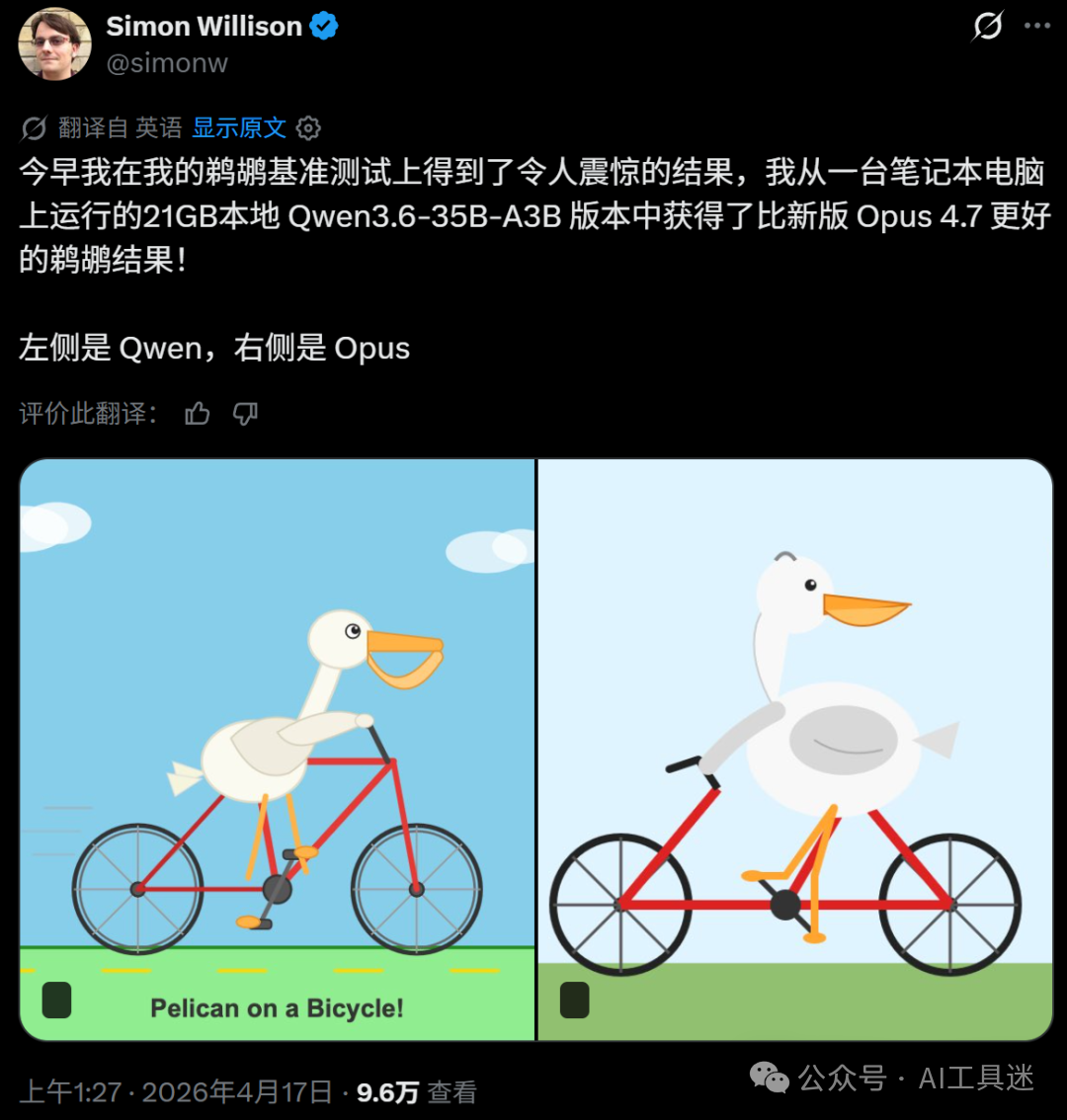 同样是在昨天晚上,千问开源了 Qwen3.6-35B-A3B(350 亿参数,激活 30 亿),有人还表示,在自己 MacBook Pro M5 上通过 LM Studio(以及 llm-lmstudio 插件)运行的千问模型生成「鹈鹕骑自行车」效果要比 Opus 4.7 好。