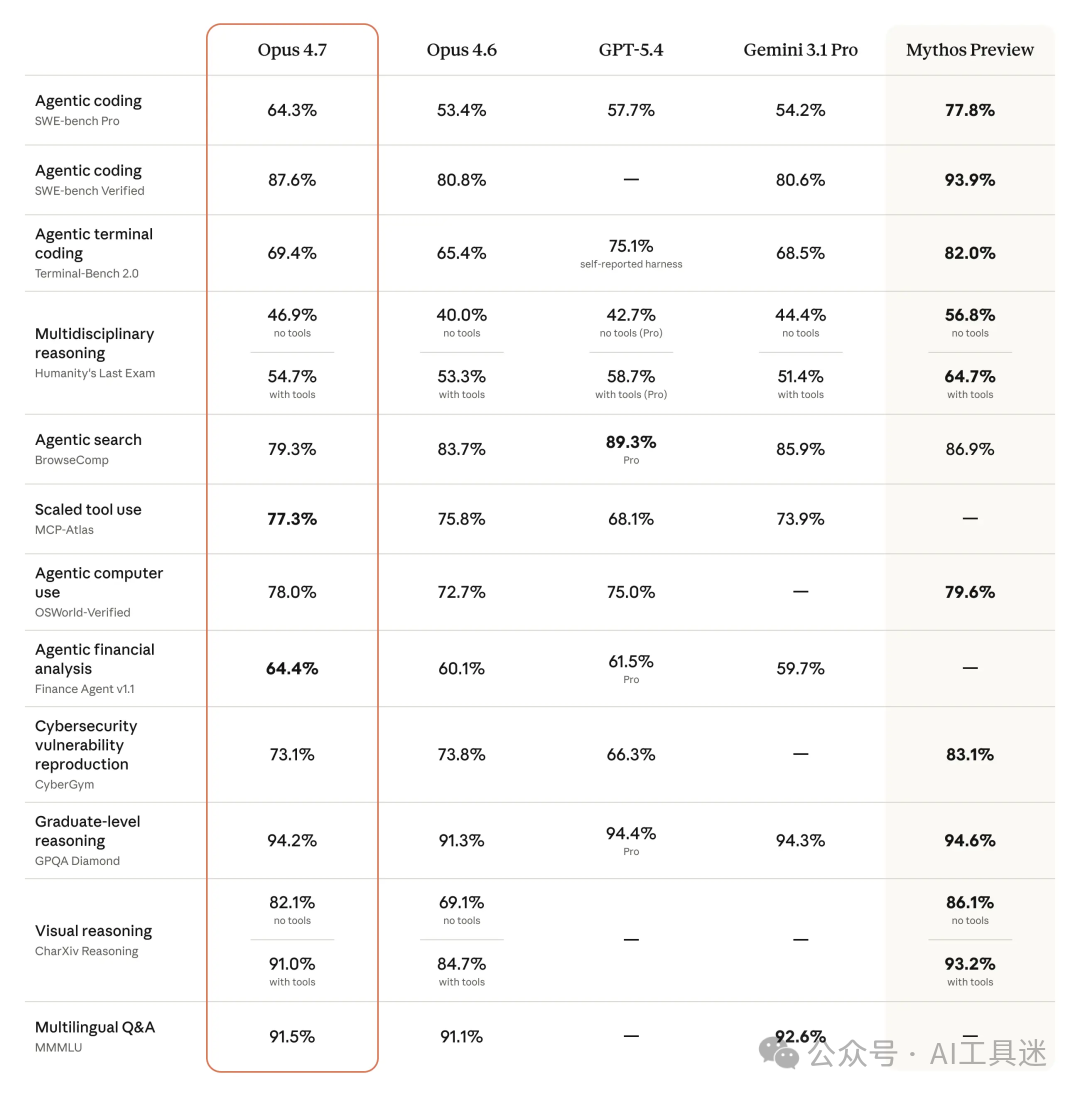 可见 SWE-bench Pro 的分数达到了 64.3%,远高于 GPT-5.4 的 57.7%。